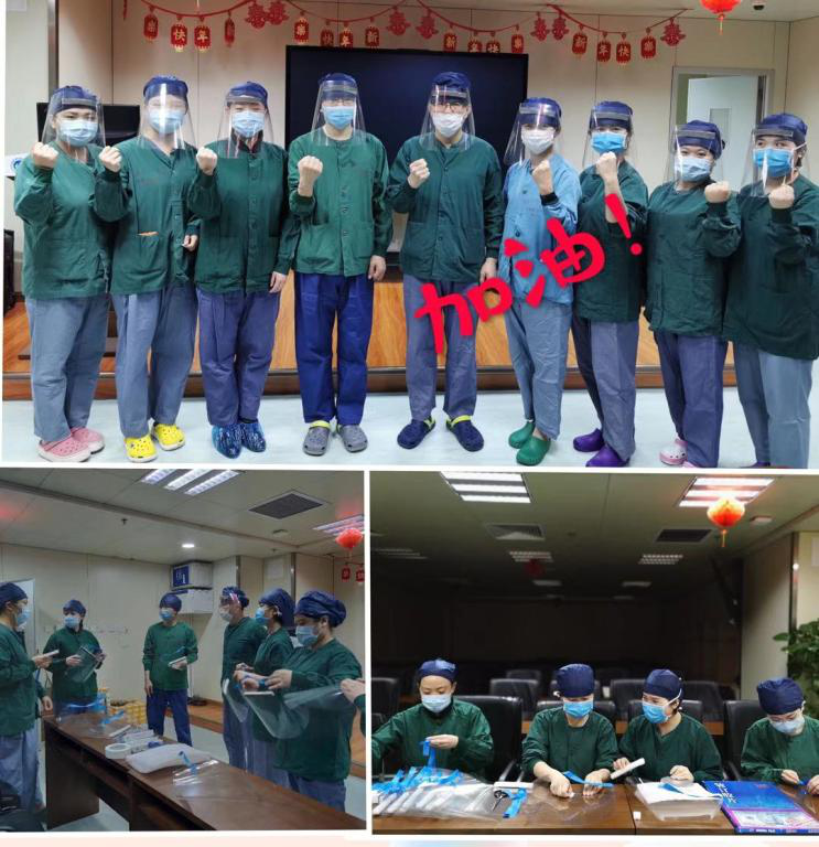 为了更安全合理的进行疑似和确诊患者的急诊手术及急救插管。由西安交大附属一院新冠肺炎综合防控领导小组和医务部组织分配,王强主任和张琳娟副主任带领科室十余位中坚骨干,分别制定了《防疫期间麻醉手术部院内急救插管工作流程》《疑似、确诊冠状病毒患者手术流程》《产科疑似、确诊冠状病毒患者手术流程》等,并针对相关流程开展模拟演练,让每一个工作人员面临突发状况时应对自如。自1月23日至今,麻醉手术部已完成包括发热或疑似肺炎患者在内的急危重症手术200余例(其中,颅脑危重症40余例,心脏外科急症25台)。其中,在对一名合并左心衰的疑似感染孕妇进行救治时,朱帅医师克服因护目镜起雾、多层手套等带来的诸多不便,凭借丰富的临床经验为成功实施椎管内麻醉,成功维持患者术中循环平稳,避免了心衰和肺水肿的继续恶化。做好急危重症患者的围术期管理,必须要解决诸多问题。其中,解决物资短缺尤为关键。抗疫期间全院防护用品奇缺,而麻醉手术部又是防护重地,为了加强术中防护,麻醉手术部的同志们集思广益、自力更生制备防护面屏,降低手术室交叉感染风险。