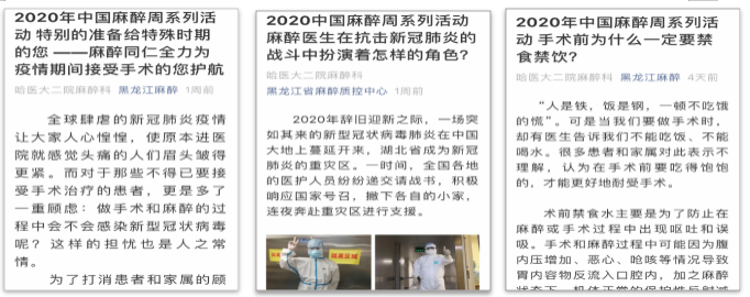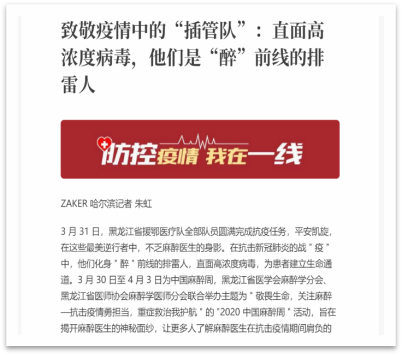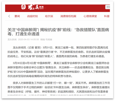 媒体宣传~~地方媒体刊载宣传龙头新闻和ZAKER哈尔滨两家新闻媒体对哈医大二院的“中国麻醉周活动”进行了报道。龙头新闻刊登了题目为《关注“中国麻醉周”—揭秘抗疫“醉前线”:“急救插管队”直面病毒打通生命通道》的文章,ZAKER哈尔滨刊登文章《致敬疫情中的“插管队”:直面高浓度病毒,他们是“醉”前线的排雷人》,向民众宣传了麻醉医生在抗击疫情的战斗中扮演的角色和肩负的使命。