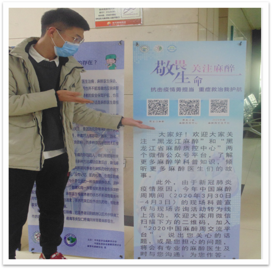 通过黑龙江麻醉和黑龙江省麻醉质控中心两个微信公众号,哈医大二院麻醉科推送麻醉科普文章,包括抗击新冠肺炎疫情期间接受麻醉的患者及医务人员的防护措施,对于疑似患者、确诊患者及普通患者的麻醉流程,降低手术患者及其家属对于感染新冠病毒的顾虑和恐惧,使患者及家属更加安心。将公众号二维码张贴在手术室患者通道和家属等候区。