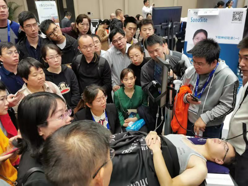 3、超声下神经阻滞Workshop:于11月3日上午举行,该板块共分为头颈部、躯干部、上肢以及下肢神经阻滞四部分。培训老师来自全国各大医院,均具有丰富的临床经验,他们分别是王云教授(北京朝阳医院)、安海燕教授(北大人民医院)、公茂伟教授(解放军总医院)、许莉教授(北京积水潭医院)、魏明(中山大学附属第一医院),李继教授(武汉同济医院)、罗富荣教授(佛山中医院)、王爱忠教授(上海第六人民医院)、王权光教授(温医附一院)、张冯江教授(浙医大附属第二医院)、吕强教授(陆军医大附属一院)以及来自北京协和医院的唐帅教授。唐帅教授指出臂丛由15根神经组成,并脱口而出说出他们的名称和支配范围。Workshop超声技术是讲座以现场操作的方式,给大家展示超声技术临床应用的具体过程及操作要点,通过四个部分的轮转观摩、手把手教学以及实际操作,现场学员学习热情高涨,极大的提高了学习效率,缩短了学习曲线。