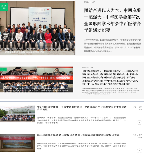 宣传和推广,也是2019年学组工作中从未忽略的工作内容的一部分。从各级会议的筹备、微信宣传,年会的板块预告,到CSA网站中西医结合学组板块的内容的发布,学组工作在一步步开展的同时,也在加强对外宣传,增进影响力。一方面,进一步宣传了中西医结合麻醉的工作内容和学术理念,另一方面,也更为祖国医学的广泛宣传,做了切实的努力和工作。