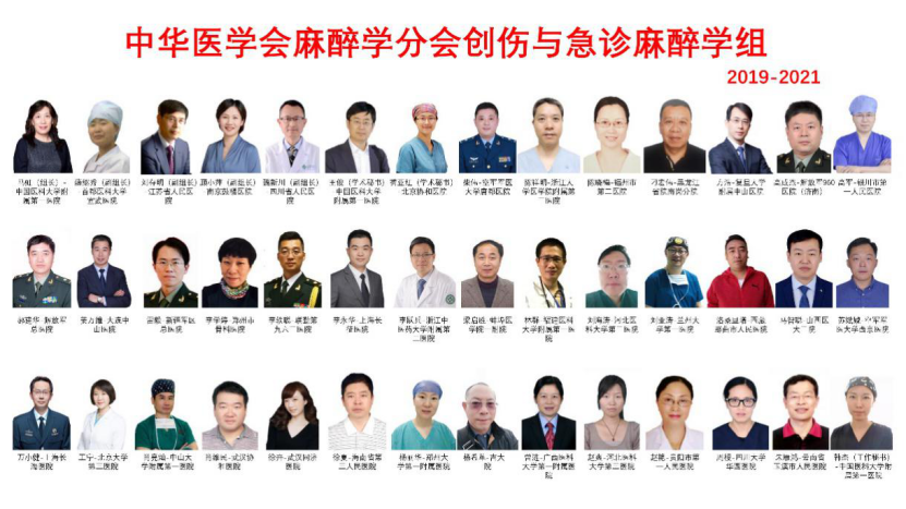 为适应创伤外科发展需要,提高创伤与急诊麻醉的理论技术水平,普及相关麻醉学的新进展、新理念,中华医学会麻醉学分会创伤与急诊麻醉筹备学组于2013年正式成立,并于2018年完成换届工作。学组确立了以中华医学会麻醉学分会副主任委员马虹教授为组长,薛纪秀教授、魏新川教授、刘存明教授、顾小萍教授为副组长,王俊教授、龚亚红教授为学术秘书,韩杰医生为工作秘书,及全国各地有代表性的各级医院的35位麻醉学专家为委员的组织架构。