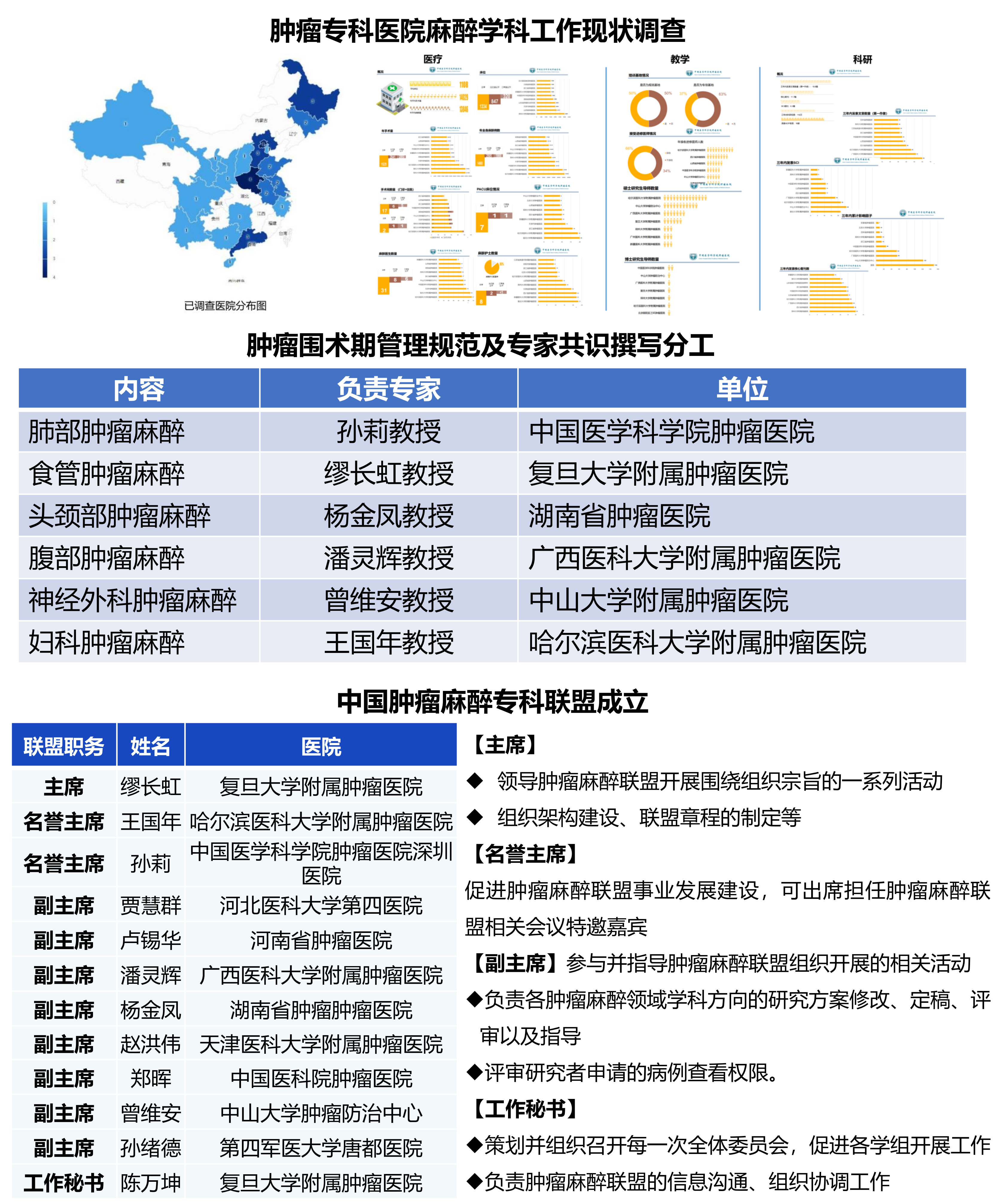 同时完善了本届学组的具体分工:①缪长虹教授负责组织开展多中心、前瞻性临床研究;②孙莉教授、潘灵辉教授和曾维安教授负责建立并完善不同种类肿瘤手术围术期管理规范及专家共识;③潘灵辉教授负责开展和保持与国(境)外大学、肿瘤中心、科研机构等单位的学术交流合作关系,与合作单位定期举办医院国际合作与交流项目;④曾维安教授负责组织开展肿瘤麻醉相关基础研究;⑤贾慧群教授负责组织学组成员单位根据专科特色开展新技术、新业务学习班,对偏远、贫困地区肿瘤专科医院麻醉学科建设给予支持,对基层医院肿瘤麻醉专业人员进行业务培训;⑥杨金凤教授负责新药临床试验及专科规范化培训;⑦郑晖教授负责全国肿瘤专科医院麻醉学科工作现状调查;⑧赵洪伟教授负责组织学组成员单位开展各项学术活动,如论文竞赛、辩论赛等。学术秘书和工作秘书一起协助各副组长开展工作,协助组长组织2019年度CSA全国麻醉年会-肿瘤与麻醉学组学术版块。