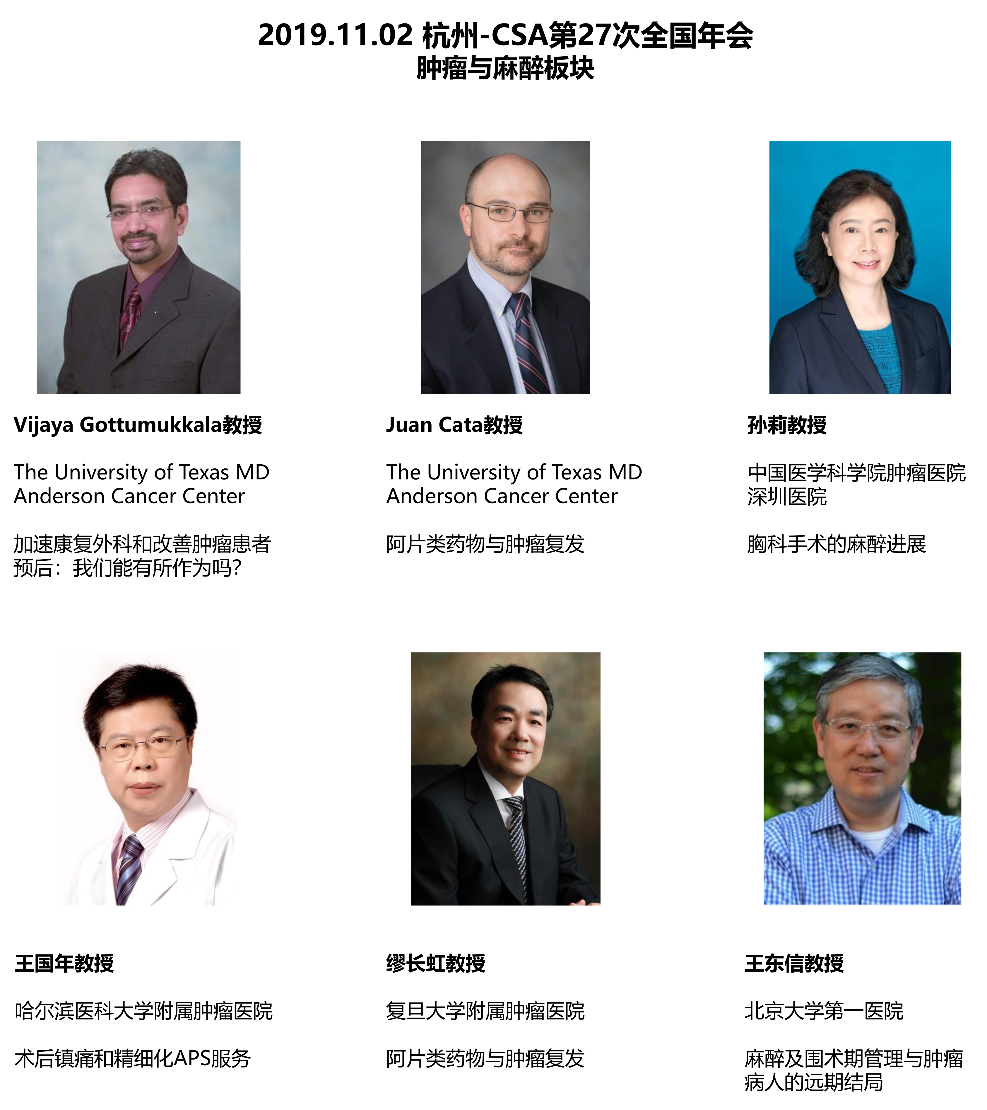 2019年10月31日至11月3日,由中华医学会、中华医学会麻醉学分会主办的“中华医学会第27次全国麻醉学术年会(2019)”在杭州举行。本次年会的主题为“一起强大”(Together & Stronger)。在本次大会中,由CSA肿瘤与麻醉学组负责的“肿瘤麻醉”版块引人注目。学组邀请了美国MD安德森肿瘤中心的麻醉科主任Vijaya Gottumukkala教授、Juan Cata教授分别带来加速康复外科、阿片类药物与肿瘤患者预后的最新研究进展,此外,学组组长缪长虹教授,名誉组长王国年教授、孙莉教授,以及王东信教授分别带来各自研究领域的最新成果,会场内学术氛围热烈,座无虚席,各医院麻醉科同仁积极提问,与专家展开了激烈讨论。