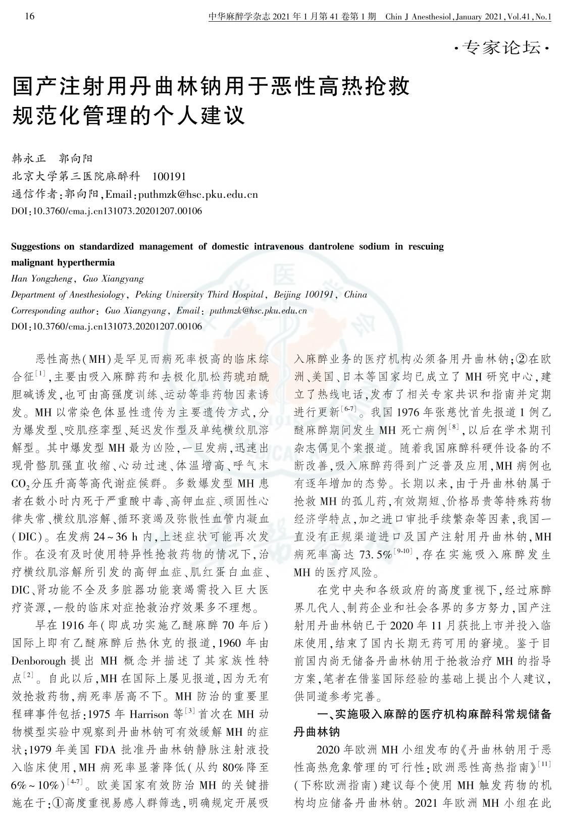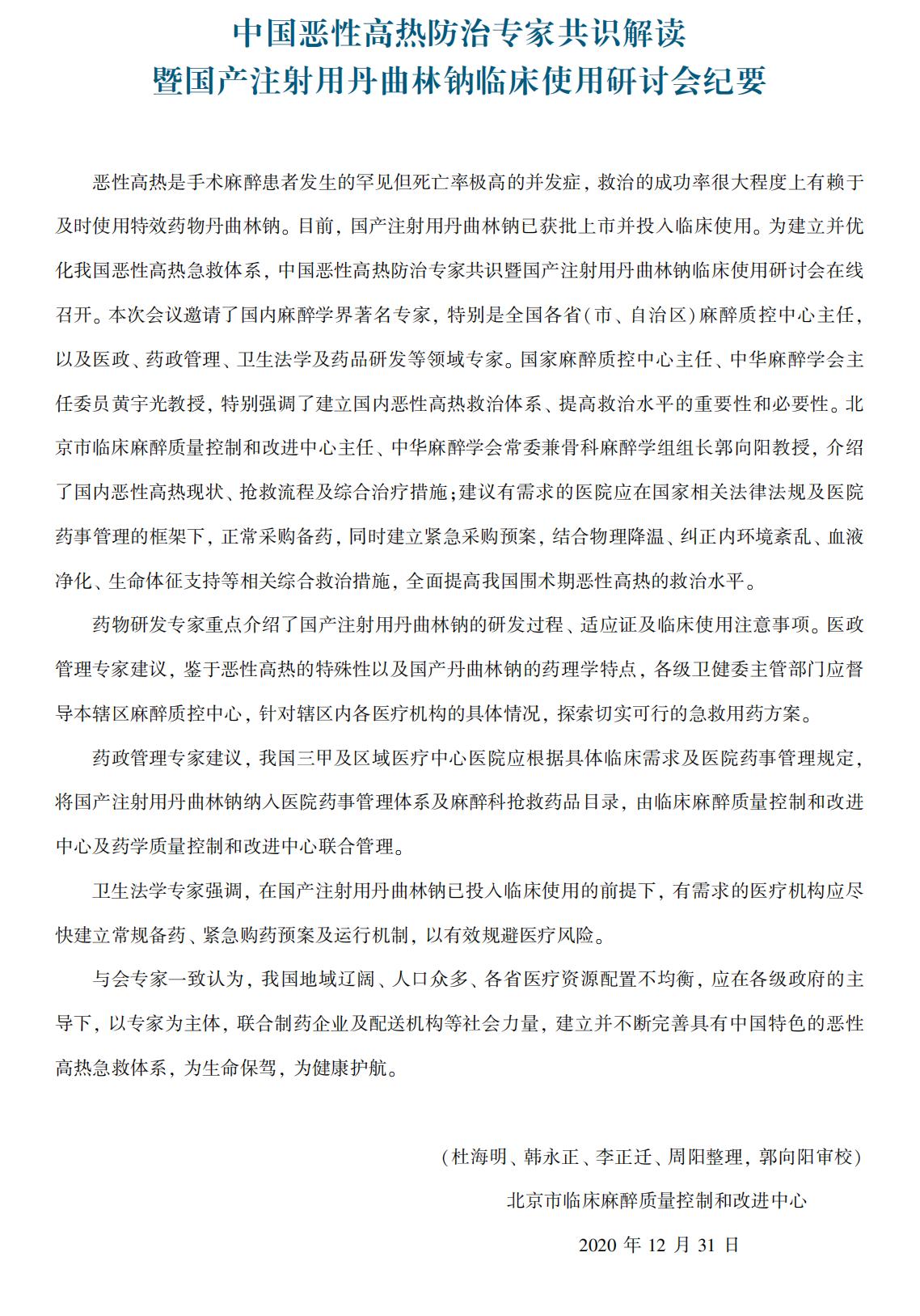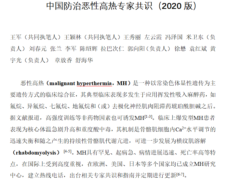 2021年中国防治恶性高热专家共识工作组在中华麻醉学杂志发表了《中国防治恶性高热专家共识(2020版)》,针对恶性高热的定义、临床表现、鉴别诊断、救治等多方面进行了阐述,为指导临床工作提供了依据...