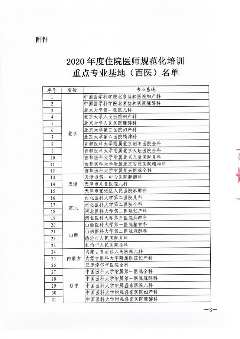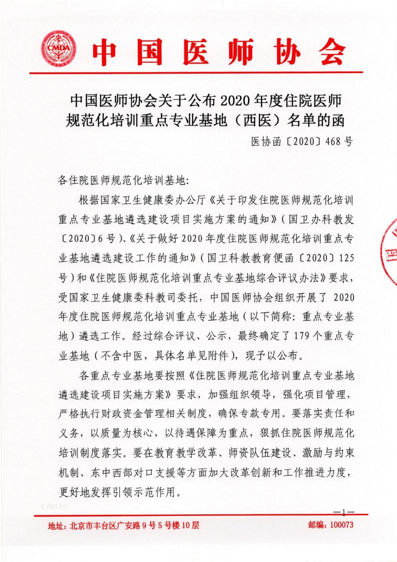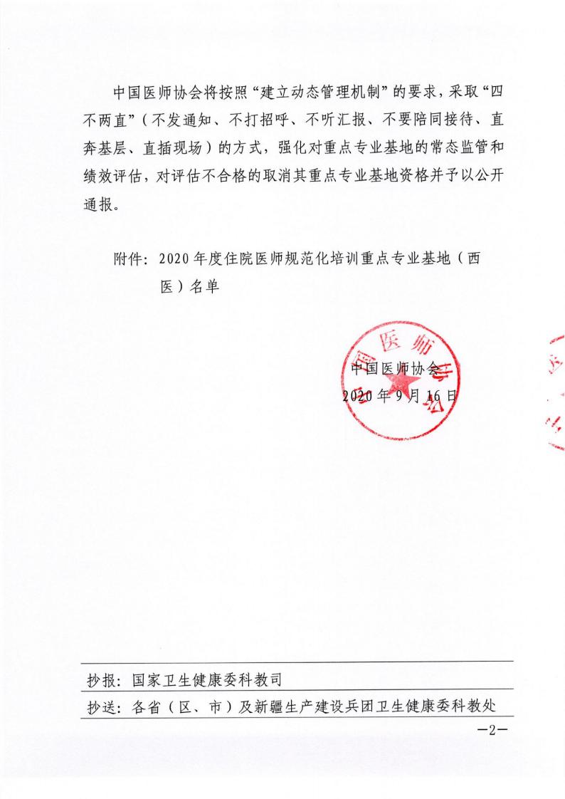 中国医师协会关于公布2020年度住院医师规范化培训重点专业基地(西医)名单的函 医协函〔2020〕468号
