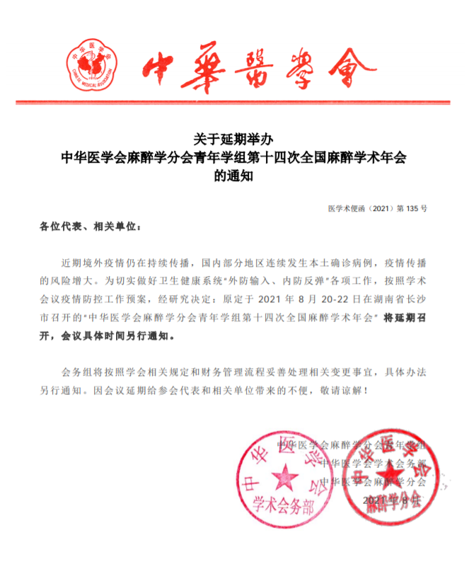 近期境外疫情仍在持续传播,国内部分地区连续发生本土确诊病例,疫情传播的风险增大。为切实做好卫生健康系统“外防输入、内防反弹”各项工作,按照学术会议疫情防控工作预案,经研究决定:原定于2021年8月20-22日在湖南省长沙市召开的“中华医学会麻醉学分会青年学组第十四次全国麻醉学术年会”将延期召开,会议具体时间另行通知。