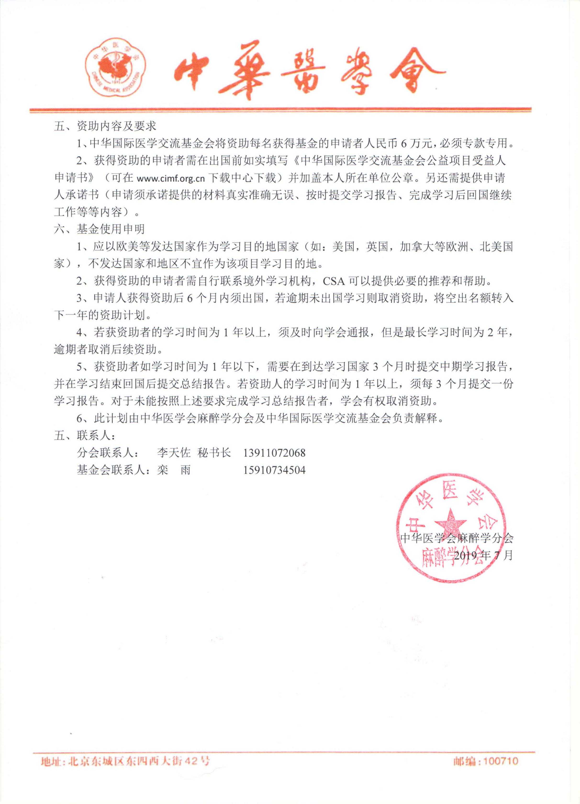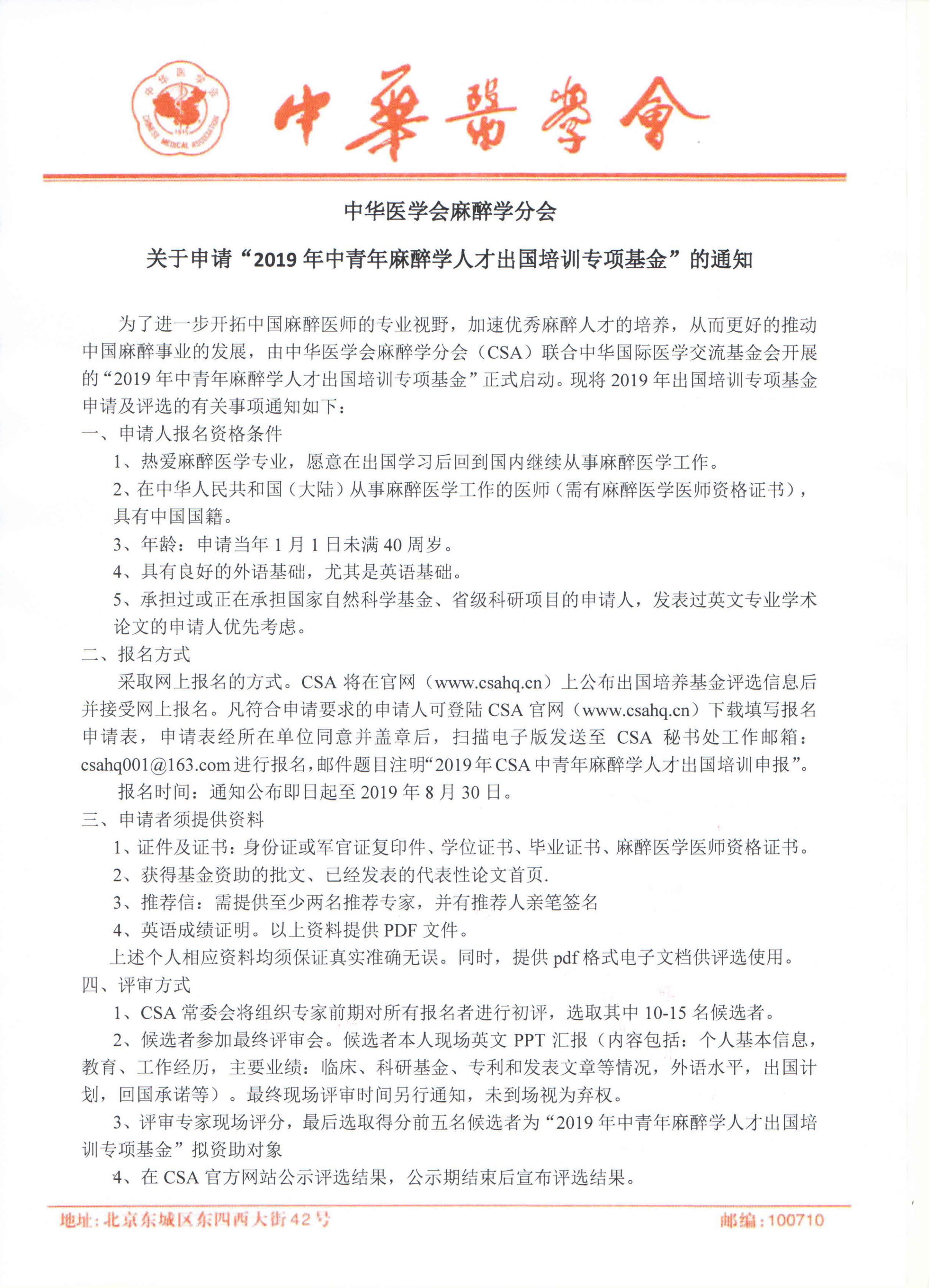 中华医学会麻醉学分会 关于申请“2019年中青年麻醉学人才出国培训专项基金”的通知