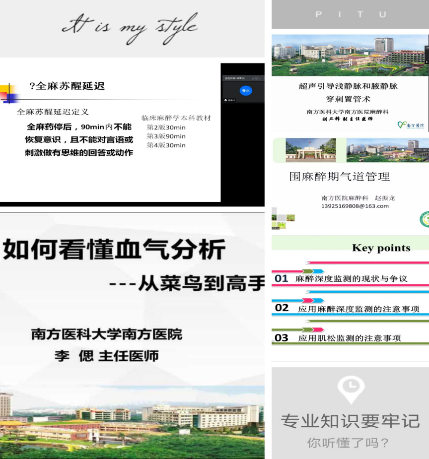 林春水教授带来的《麻醉恢复期麻醉并发症的识别与处理》,让我们了解麻醉恢复期与呼吸、循环系统相关的并发症症状,麻醉恢复延迟因由、预防、处理,内容逻辑性强。刘卫锋教授从超声的基础知识为起点,使我们对血管的解剖、穿刺路径及注意事项有了新的认识。气道管理是围麻醉期的重点,做好气道的管理是安全麻醉的关键环节。赵振龙教授从气道解剖到评估、管理及困难气道处理的精彩讲解,让我们以麻醉医生的角度重新认识气道管理的相关知识,使我们知其然也知其所以然。李偲教授从动脉血气的正确采集到血气分析各个指标的解读,教我们《如何看懂血气分析》,讲解生动又易懂,让人意犹未尽。叶靖教授详细阐述了围术期血液保护措施,由术前自体血储存(PABD)到突发大出血的应对,再到术中麻醉深度监测的意义和必要性,加深了我们对血液保护和麻醉深度监测的认知,教导我们如何成为麻醉医生心中的理想型麻醉专科护士。
