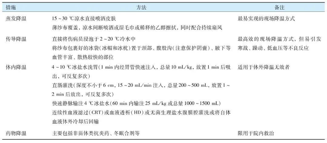 4.2.1 体温管理目标温度管理(target temperature management,TTM)是指在特殊群体中实现并维持特定核心温度以改善临床预后的治疗策略[21]。高温环境战创伤救治推荐TTM策略,并强调贯穿整个围术期[22]。其要点为: 尽早脱离高温环境,尽早监测核心温度,尽早有效降温,尽早达到目标温度。高温环境战创伤伤病员通常可安全耐受0.1 ℃/min的降温速度[23],应力争在30 min内将核心温度降至39.0 ℃ 以下,2 h内降至38.5 ℃ 以下,当核心温度降至38.5 ℃时,停止降温或减弱降温强度,维持直肠温度在37.0~38.5 ℃,以避免体温过低[24]。主要降温措施见表1[25-26]。