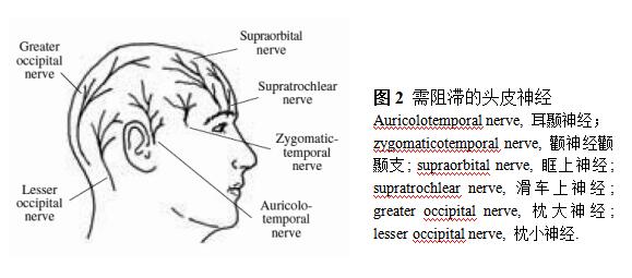 常需阻滞的头皮神经主要包括(图2):① 耳颞神经(三叉神经下颌支);②颧神经颧颞支(起源于三叉神经上颌支的颧神经末端);③ 眶上神经(起源于三叉神经眼支);④ 滑车上神经;⑤ 枕大神经;⑥ 枕小神经。通常将3.6 mg/kg罗哌卡因或2.5 mg/kg左旋布比卡因稀释至40~60 ml,加用肾上腺素(1׃ 200000),在阻滞15 min之后再可开始手术操作。