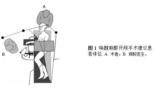 唤醒麻醉开颅手术患者体位摆放原则为:①患者舒适;②保持呼吸道通畅。该类手术患者多处于侧卧位或半侧卧位,铺放手术单后要保证患者视野开阔,减少其焦虑情绪;同时确保术中神经监测时患者面向麻醉医生,便于及时观察并处理可能发生的各种情况,以配合手术操作,同时要注意加温毯的应用和体位保护。