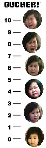 是将垂直的0-10的数字量表和面部表情结合的一种评分方法,还有专门用不同亚洲儿童面部表情制作的评分尺。其与面部表情评分及VAS评分有很好的相关性(图4)。此量表可以较好地评估患儿术后或使用镇痛药物后的疼痛程度变化情况。但一般只适用能数到100的6岁以上儿童。