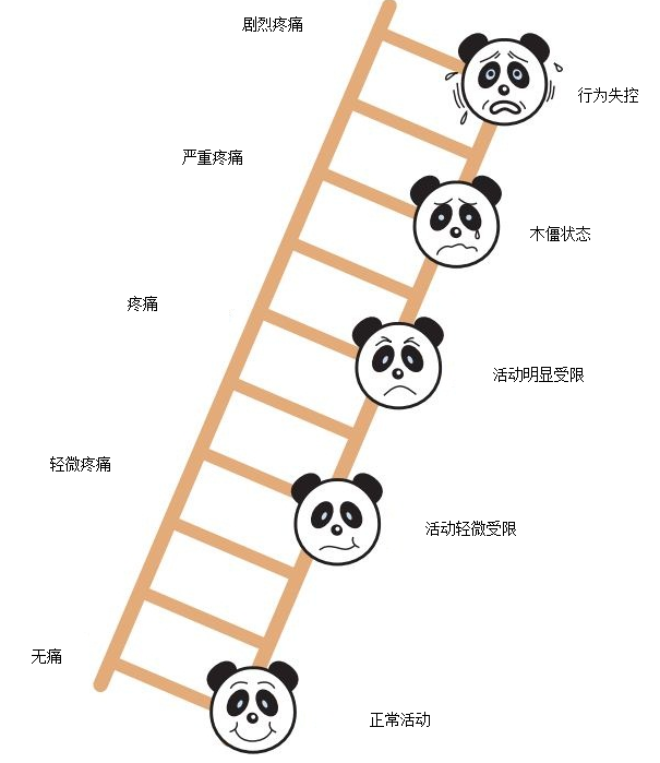 是在Oucher 评分的基础上用全世界小朋友都钟爱的大熊猫面部表情代替了欧洲或者亚洲儿童的面像,将不同面部表情的大熊猫放在梯子上,越到梯子的上端疼痛越严重,同时孩子的活动也受到影响。分值0-10分,其适用范围同Oucher 评分(图5)。