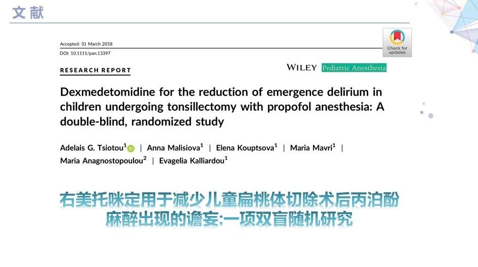 【Journal Club】右美托咪定用于减少儿童扁桃体切除术后丙泊酚麻醉出现的谵妄:一项双盲随机研究