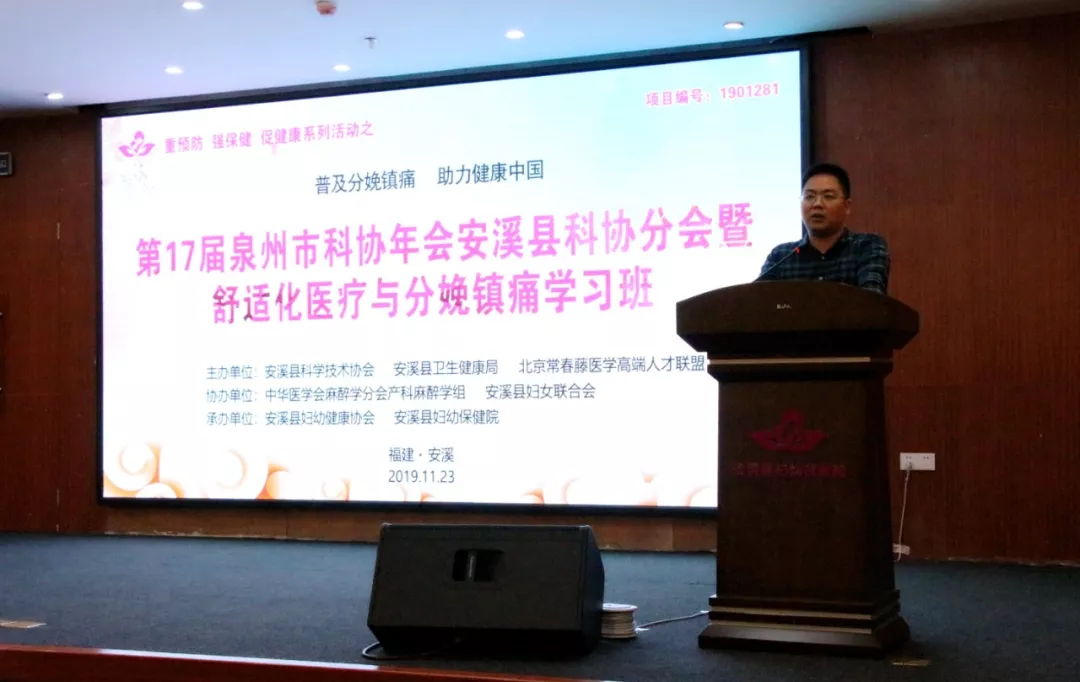 11月23日,第17届泉州市科协年会安溪县科协分会、2019·常春藤·无痛分娩基层行暨舒适化医疗与分娩镇痛学习班、中华医学会麻醉学分会产科麻醉学组分娩镇痛基层行于福建省安溪县成功举办。安溪县卫生健康局党组成员、卫健系统党委专职副书记、纪委书记朱炳山,安溪县妇幼保健院书记郑贵阳,北京常春藤联盟医学高端人才副主席尹玲教授,中华医学会麻醉学分会产科麻醉学组副组长曲元教授,产科麻醉学组学术秘书姚伟瑜主任,玛珂迩妇产医院业务院长陈浩等专家和领导出席了会议。会议吸引了全市各医院从事妇产、麻醉领域代表200余人参会。