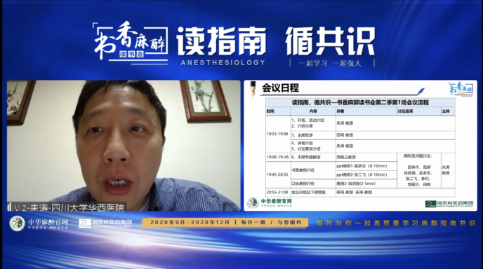 2020年9月29日首期“读指南/循共识”活动如期举行,本次活动的主题是《常见消化内镜手术麻醉管理专家共识》解读会。本次会议在四川大学华西医院麻醉手术中心书记、副主任朱涛教授的主持下顺利进行,首都医科大学附属北京友谊医院麻醉科田鸣教授担任本次会议的大会主席、上海交通大学医学院附属仁济医院麻醉科副主任苏殿三教授担任本次会议的讲者。另有其他 6 位特邀讨论嘉宾共同参与了此次会议。