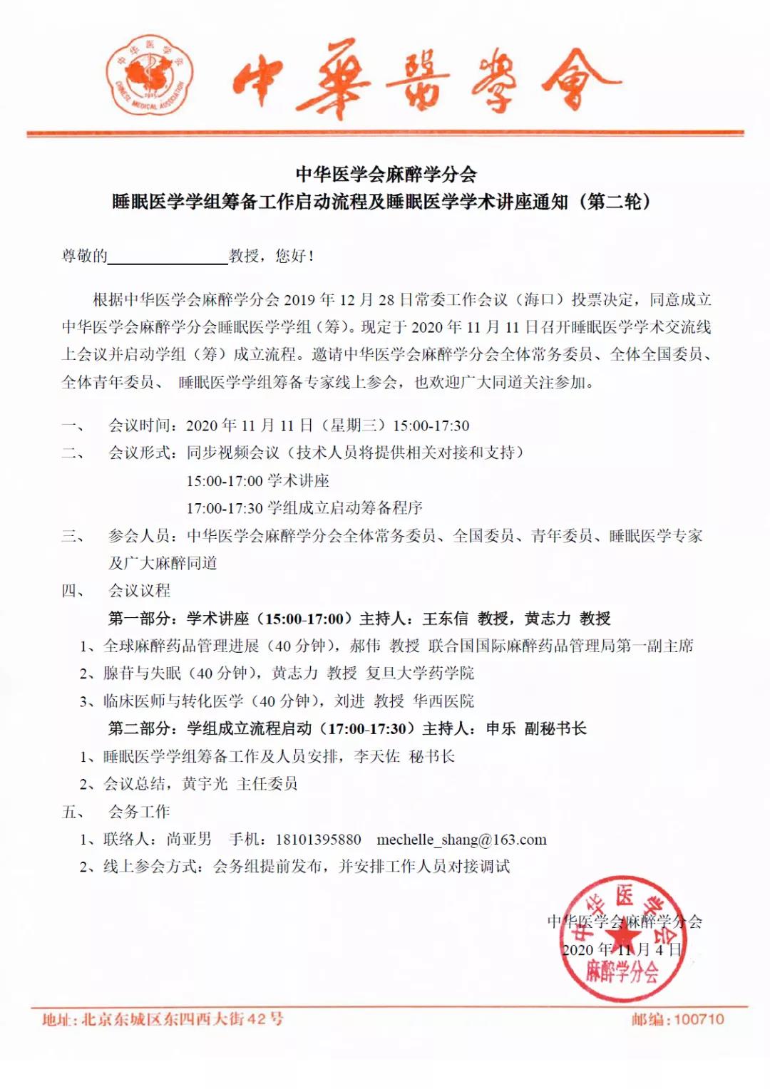 现定于2020年11月11日【15:00--17:30】于线上召开中华医学会麻醉学分会睡眠医学学组(筹)筹备工作启动流程及睡眠医学学术讲座。