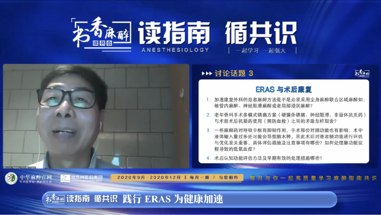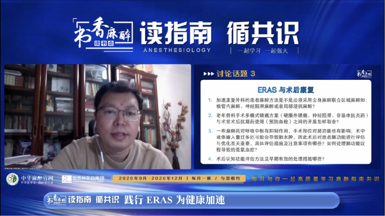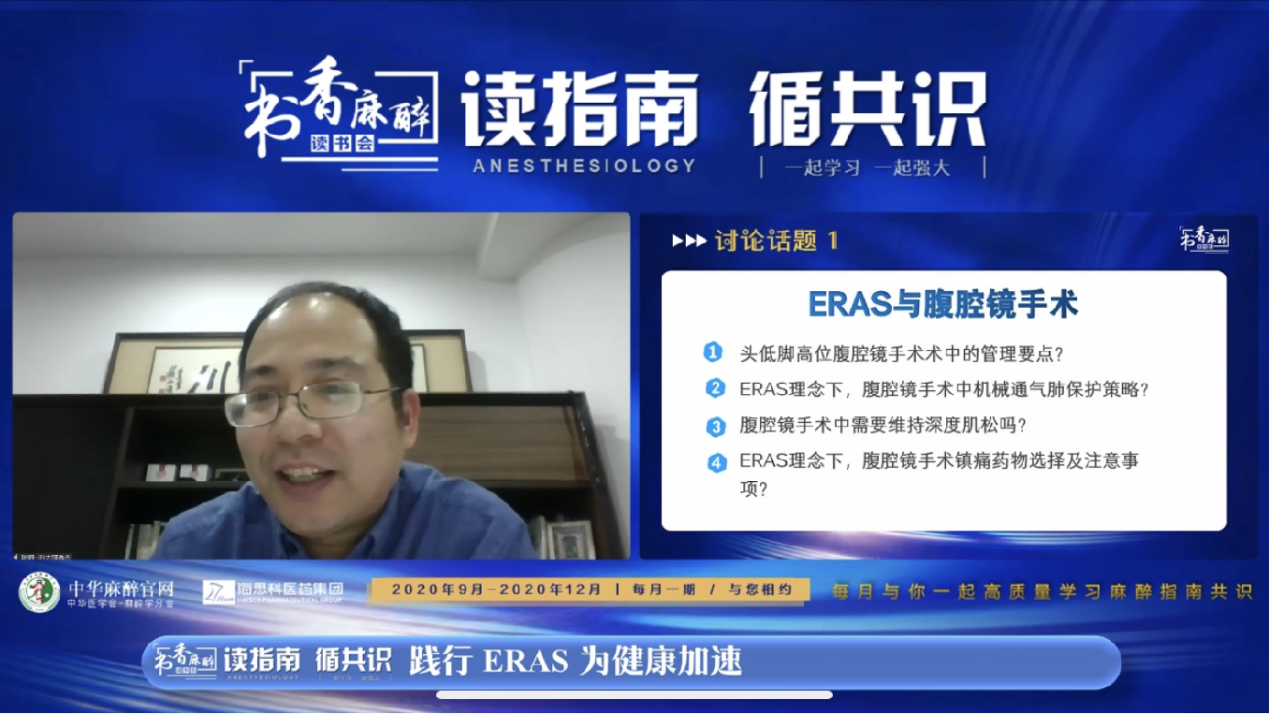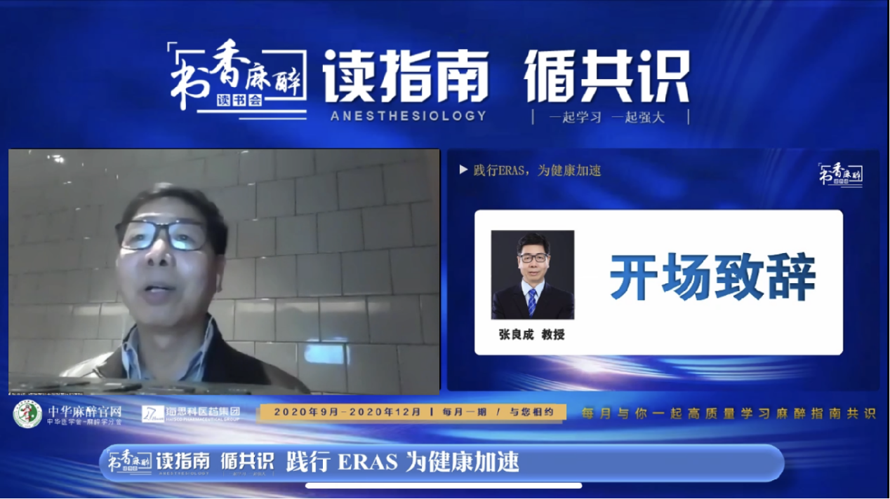 张良成教授作为本次会议的主持,对“书香麻醉·读书会”系列活动给予高度认可。张教授介绍到读书会自2020年3月开办以来已经举办了16期,最多一场的点击量超过23万人次,取得了良好的效果。本期主题“践行ERAS,为健康加速”,希望能够通过本场活动对ERAS临床相关话题做一个回顾与讨论,从而更好的践行ERAS理念!