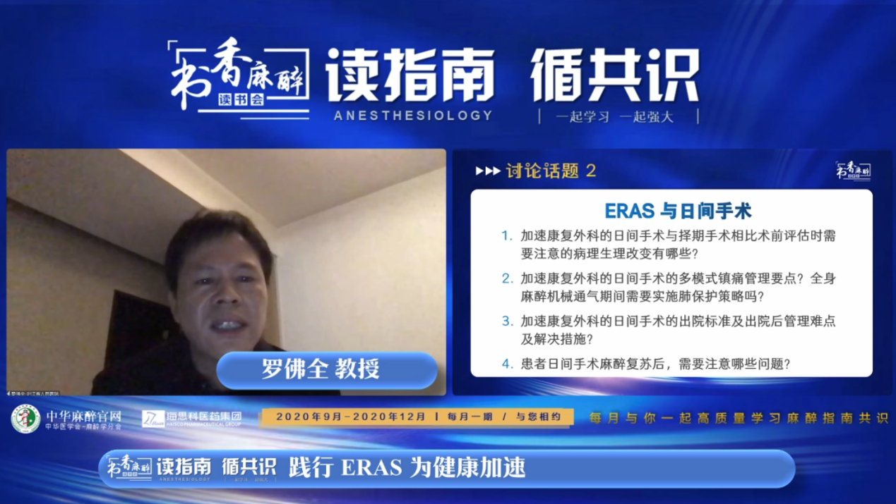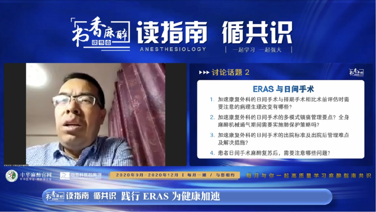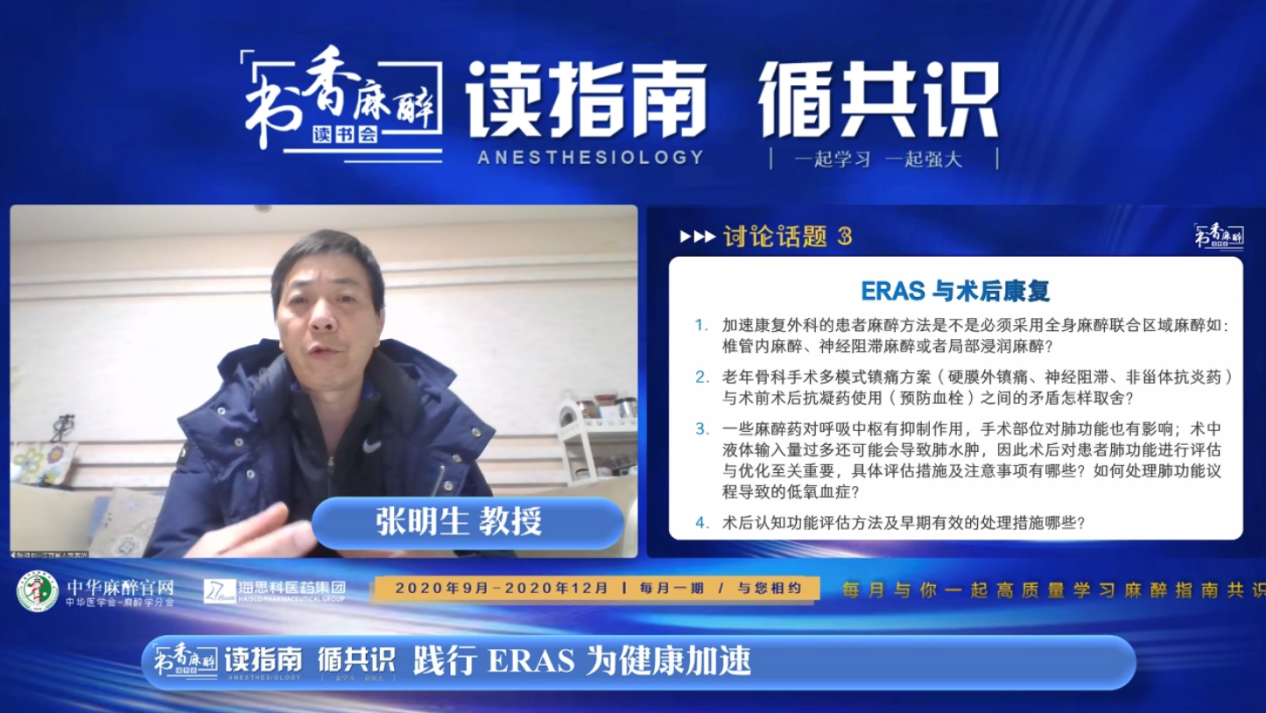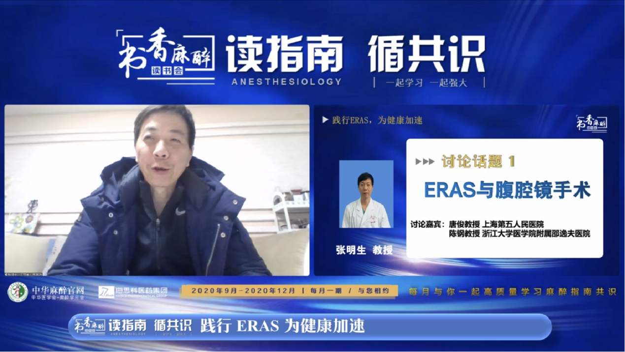 张良成教授作为本次会议的主持,对“书香麻醉·读书会”系列活动给予高度认可。张教授介绍到读书会自2020年3月开办以来已经举办了16期,最多一场的点击量超过23万人次,取得了良好的效果。本期主题“践行ERAS,为健康加速”,希望能够通过本场活动对ERAS临床相关话题做一个回顾与讨论,从而更好的践行ERAS理念!
