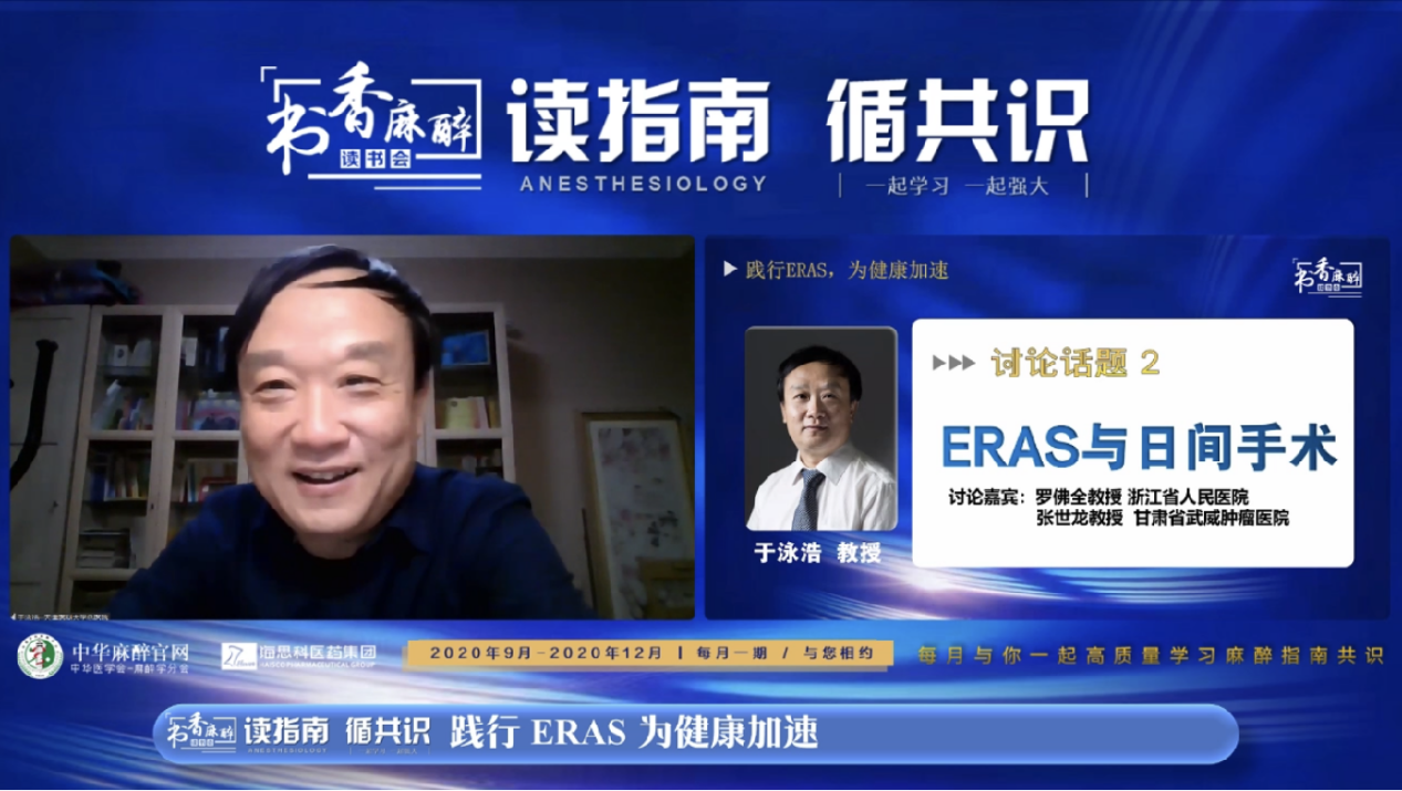 2021年1月28日隆重推出“书香麻醉读书会之新年特别论坛---践行ERAS,为健康加速”!福建医科大学附属协和医院张良成教授、天津医科大学总医院于泳浩教授,江西省人民医院张明生教授等3位大咖及浙江大学医学院附属邵逸夫医院陈钢教授、浙江省人民医院罗佛全教授、解放军总医院第三医学中心徐龙河教授、上海市第五人民医院唐俊教授、甘肃省武威肿瘤医院张世龙教授等5位讨论嘉宾齐聚云论坛,为我们带来了一场ERAS与精准麻醉管理的饕餮盛宴。