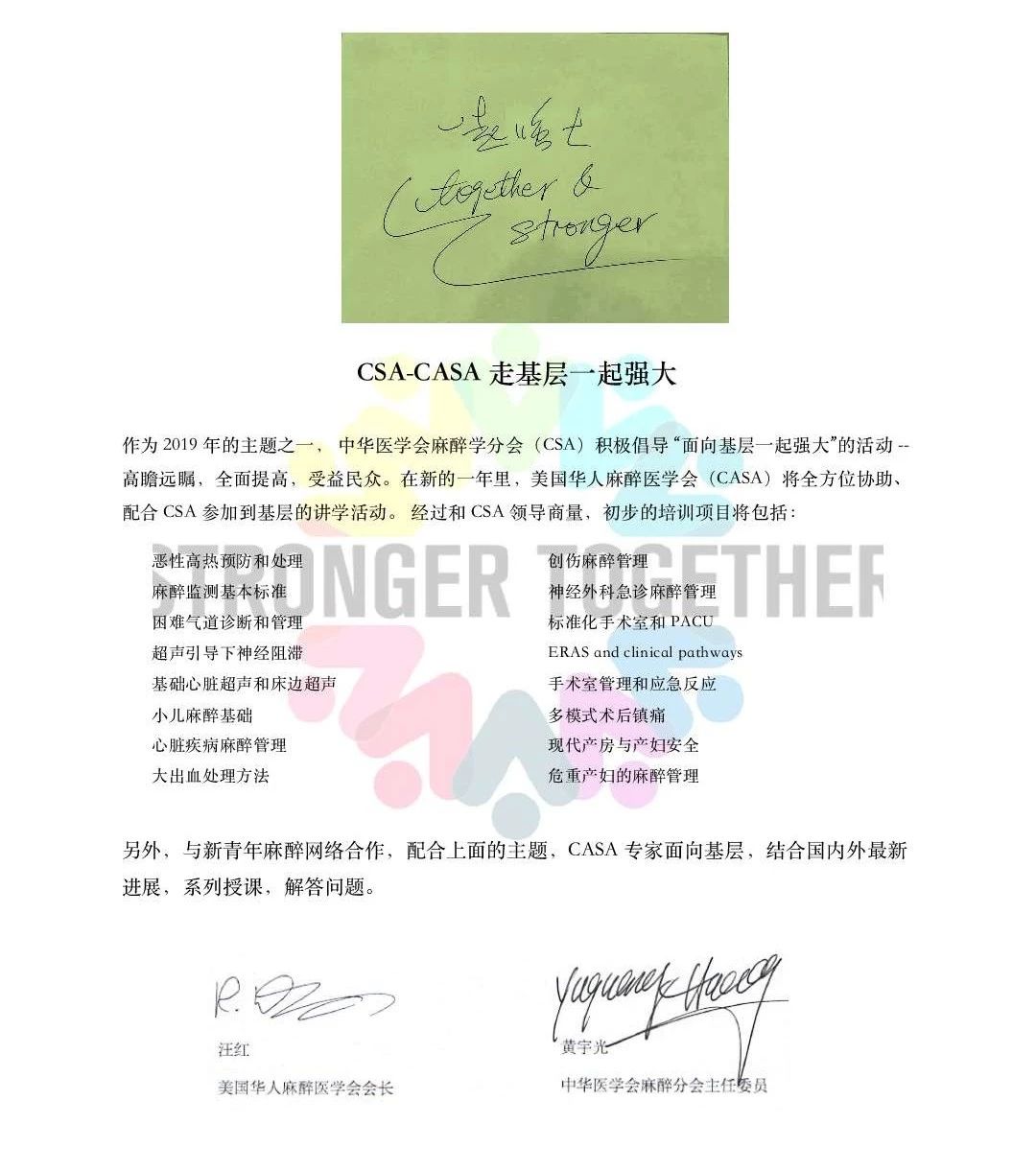 美国华人麻醉医学会(CASA)是致力于国内麻醉学科进步、交流学习、共享资源的非营利性团队,特别是在麻醉医师教育培养方面取得了很大成绩,在国内国际享有很高声誉。2019年,为了加强基层麻醉学科建设,提高基层麻醉管理水平,中华医学会麻醉学分会积极倡导“面向基层-一起强大”系列讲学活动,美国华人麻醉医学会(CASA)则全方位配合CSA参加到基层的讲学活动中,结合国内外新进展、系列授课、解答问题。
