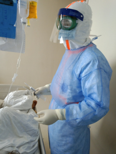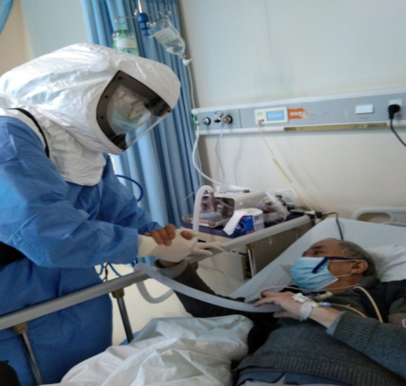 接到隔离病房急救插管电话后,林云教授身先士卒,迅速携带急救插管箱,严格按照三级防护标准进行个人防护,进入隔离病房。给氧、推药、插管、接呼吸机、固定气管导管,这在平日里熟悉得不能再熟悉的操作,此刻在隔离病房内似乎都变得不那么容易:戴着两层防护口罩,令人呼吸困难,更别说得拉大嗓门才能够交流;穿着不服帖的防护服,似乎束手束脚;戴上正压头套限制了头部动作,怎么看都像是个笨手笨脚的机器人。可是当插管抢救成功后,患者的生命体征逐渐平稳,监护仪上跳动的数字才让林云教授的心情得以平复。顾不上喘息,第二个电话接踵而至,林云教授交待了患者后续呼吸支持治疗方案后,又来到第二个患者身旁……由于穿戴严密厚重,林云教授只能通过简单的手势和问候,尽可能地同患者进行简短的交流,患者在他的鼓励下那些彷徨甚至惊恐的眼神转为更多的信任和理解。