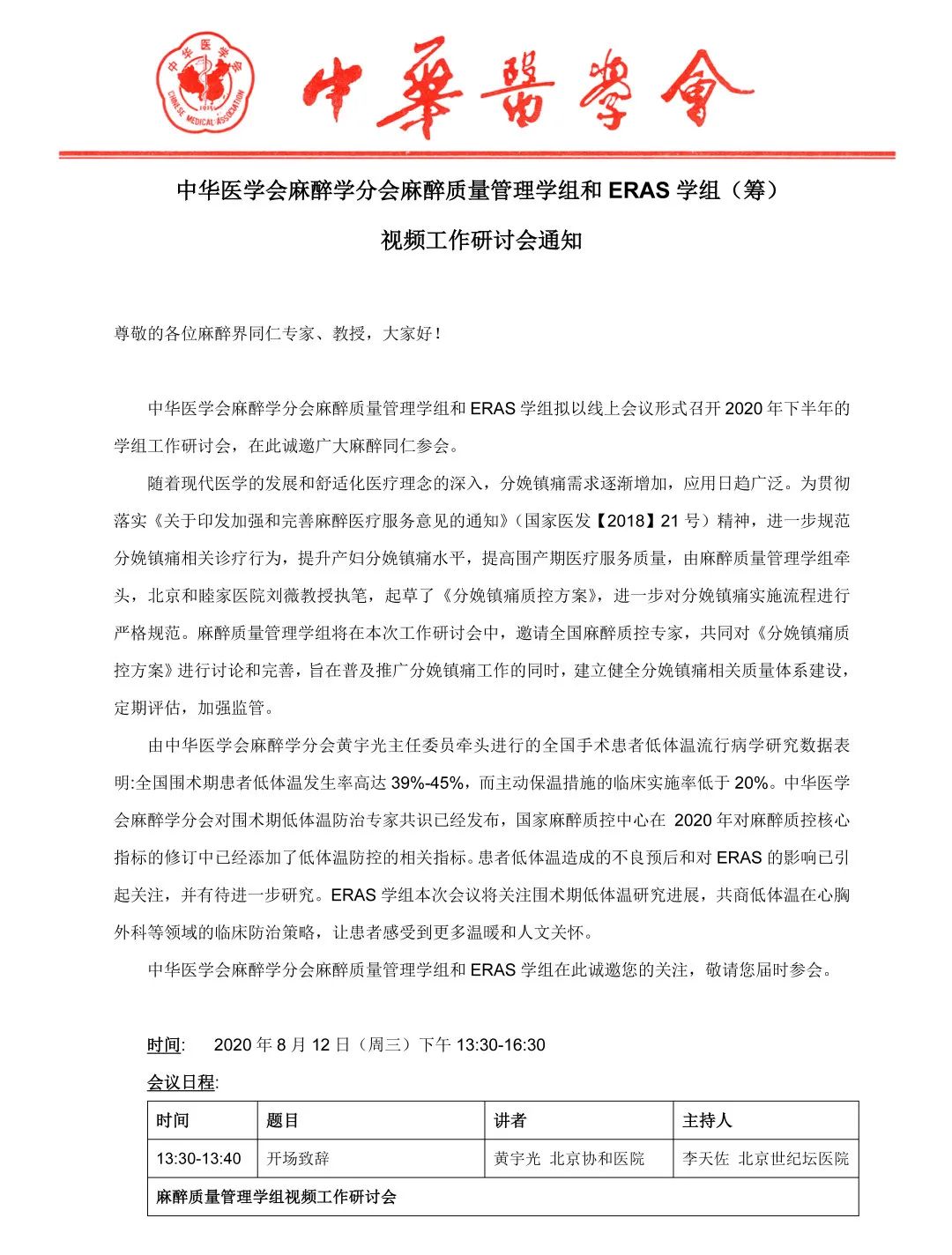 中华医学会麻醉学分会麻醉质量管理学组和ERAS学组拟以线上会议形式召开2020年下半年的学组工作研讨会,在此诚邀广大麻醉同仁参会。