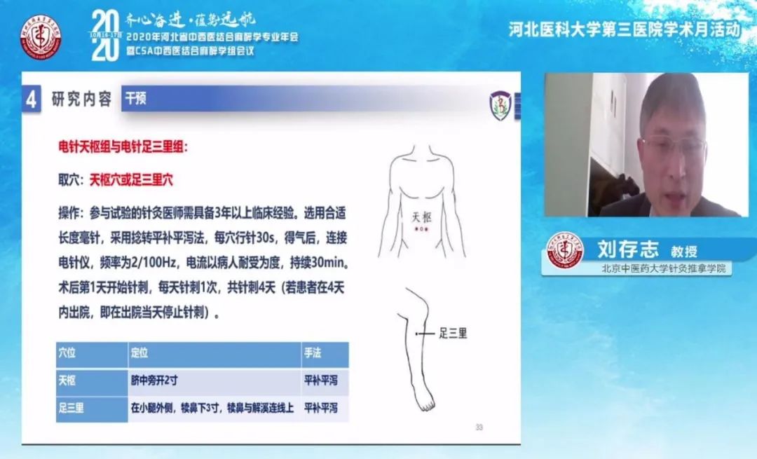 北京中医药大学针灸推拿学院的刘存志教授介绍了电针治疗围手术期肠麻痹的临床研究。目前针灸在围手术期中的临床应用逐渐由单纯麻醉向术前、术中、术后等多方向、多模式发展。而术后肠麻痹是肠外科手术后恢复的主要决定因素,减少术后肠麻痹的发生可降低术后并发症的发生率以及缩短住院时间。已有多项研究结果显示,针灸尤其是电针可以促进腹部手术后胃肠功能恢复,缩短首次排气排便时间。刘教授团队的研究结果表明电针天枢穴和足三里穴可明显缩短术后首次排气时间,且电针足三里穴可明显缩短术后首次排便时间。这项研究结果为麻醉医生在中西医结合领域的科学研究提供了新的思路。