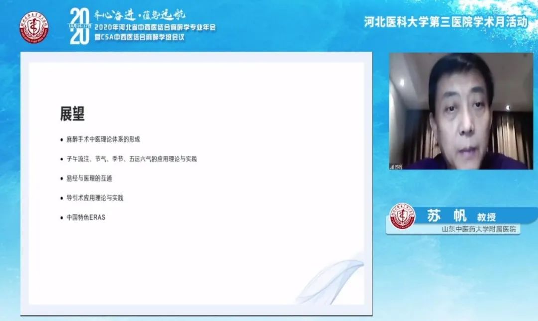 山东中医药大学附属医院的苏帆教授介绍了麻醉手术中医理论创新与转化。如何将麻醉与手术过程中的中医理论和实践实现创新与转化一直是当前研究领域的一个热点话题,苏教授通过结合自身实践为我们讲解了麻醉现象如何用中医理论解释,并且鼓励年轻医师用中医的思维来理解麻醉中的问题,通过中医理论的指导转化为临床实践的应用。将中医理论的五行、经络气血等体系集大成于麻醉手术ERAS发展中,形成一套中西医结合的麻醉理论体系,这将对麻醉领域起到巨大的促进作用。苏教授富有启发性的讲解让我们对中西医结合的领域有了更高的展望。