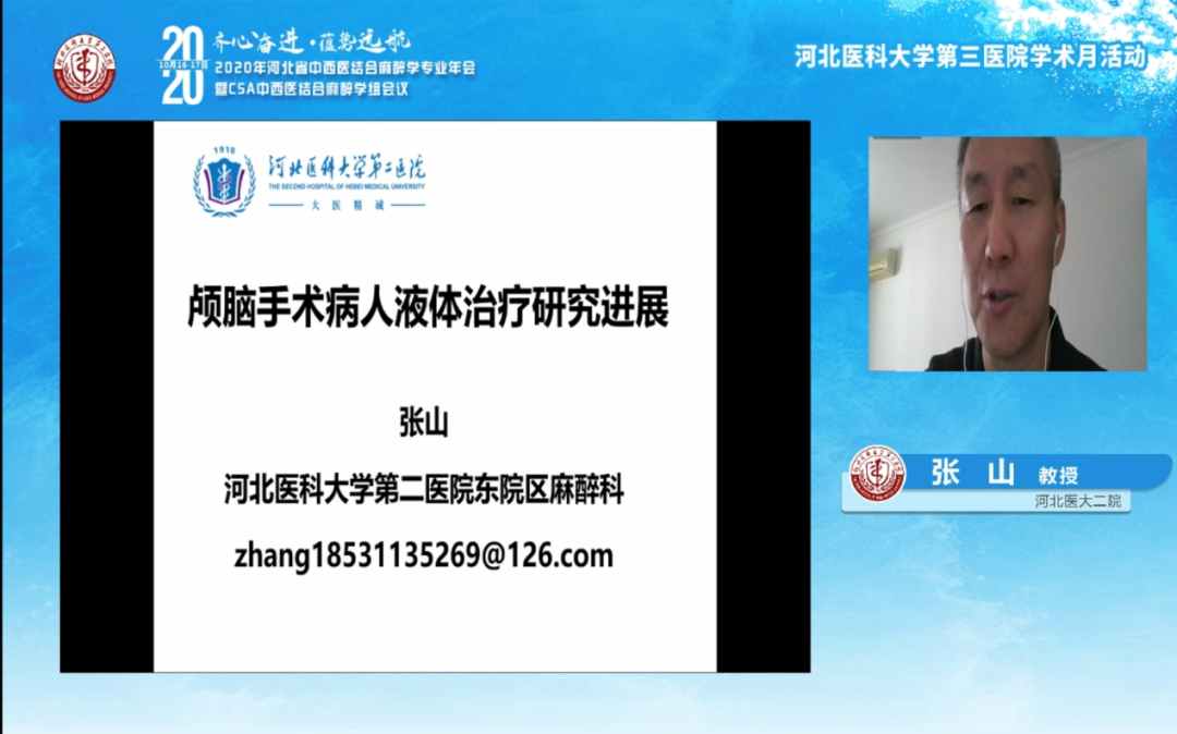 河北医科大学第二医院的张山教授讲解了颅脑手术病人液体治疗研究进展。张教授介绍了河北医科大学第二医院临床常见的颅脑手术类型,简单为我们讲述了颅脑损伤的分类,并指出我们目前防治的关键是继发性颅脑损伤。颅脑手术病人术前血容量相对或绝对不足,因此颅脑手术病人液体治疗或麻醉管理的终极目标为维持脑基本生理活动及高级认知功能。外源性神经刺激可能成为恢复NVC功能的潜在干预途径。张教授详细介绍了脑血流调控三要素、脑血流综合调节的临床应用和优化脑血流的临床应用。目标导向液体治疗已被证明与腹腔内手术后整体疗效的改善有关,但这一有利结果能否归因于脑血流的优化还有待于进一步研究。张教授提出,清楚地了解对血脑屏障内皮糖萼的观察方法有助于今后研究的开展。在授课的最后,张教授为我们播放了旁流暗视野成像技术(SDF)的视频,加深了我们SDF技术的了解。