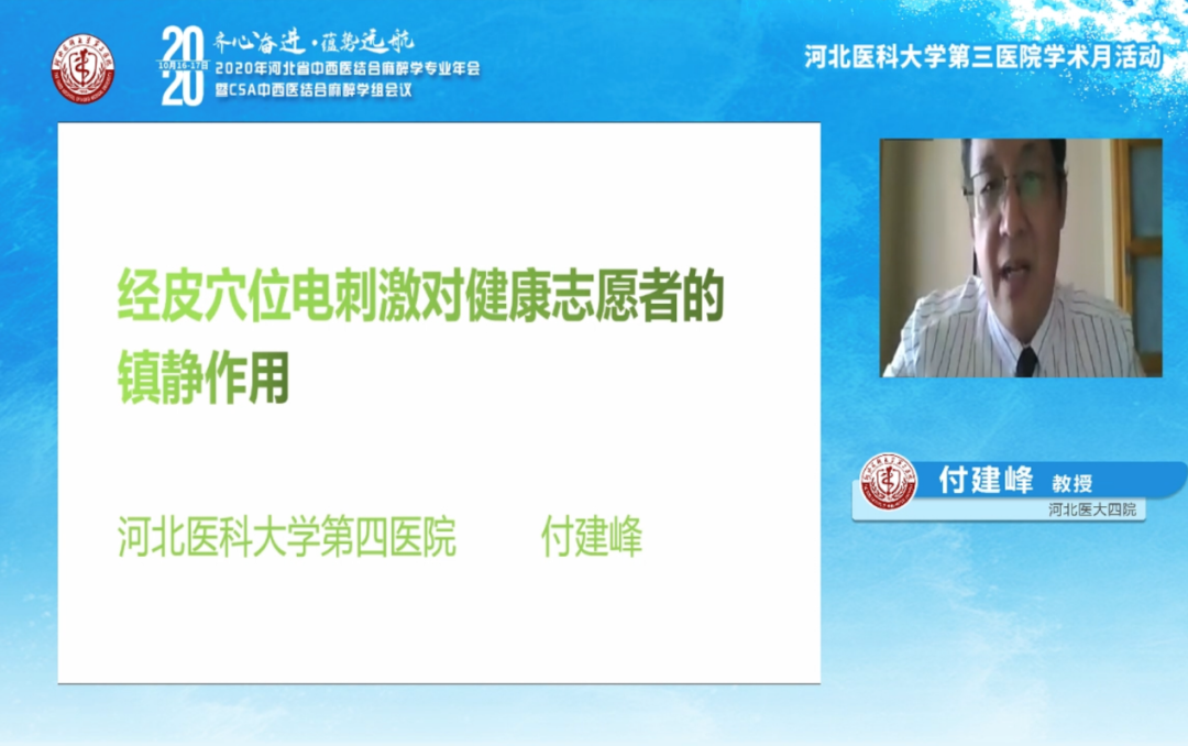 河北医科大学第四医院的付建峰教授介绍了经皮穴位电刺激对健康志愿者的镇静作用。付教授以《时代》周刊上一张封面图片为切入点,展开了对本次课题的讨论。经皮穴位电刺激(TENS)技术作为多模式镇痛的一线常规方案,可使术后镇痛药物用量降低25%。付教授认为,微创麻醉是我们今后的努力方向,多学科合作有利于促进麻醉学的发展。付教授介绍了穴位刺激围术期应用专家共识,指出了围术期应用穴位刺激的必要性,以及应用穴位刺激在术前、术中和术后的作用和优势。付教授随后介绍了经皮穴位电刺激对健康志愿者的镇静作用的研究背景、研究目的、研究方法和研究结果,得出结论为经皮穴位电刺激可以安全应用,但还需要进行进一步探索。付教授的讲解让我们对经皮穴位电刺激的研究有了更加深入的了解。