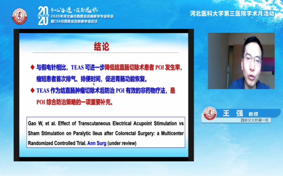 西安交通大学第一附属医院的王强教授讲解了针刺调节术后肠动力的临床与基础研究。王教授从POI临床问题、电针临床疗效和POI机制探索展开讨论。POI为高发术后并发症,可能会导致住院时间延长、住院费用增加、再入院率提高、肺部并发症死亡率增加、心血管并发症死亡率增加。王教授指出,术前纠正电解质紊乱、贫血,术中应用合理的手术和麻醉方式,术后采用多模式镇痛、胃肠减压、抗生素和肠外营养对POI的防治有一定的效果。近年来,中西医结合治疗方法在临床中普遍应用,王教授为我们提供了针灸调节胃肠功能的高质量临床证据,简单介绍了针刺调节术后肠动力研究的研究目的、设计思路、纳入排除标准、穴位选择原理、干预方案、评价方案、评价指标和结论,为麻醉医师在针刺疗法方面提供了新思路。