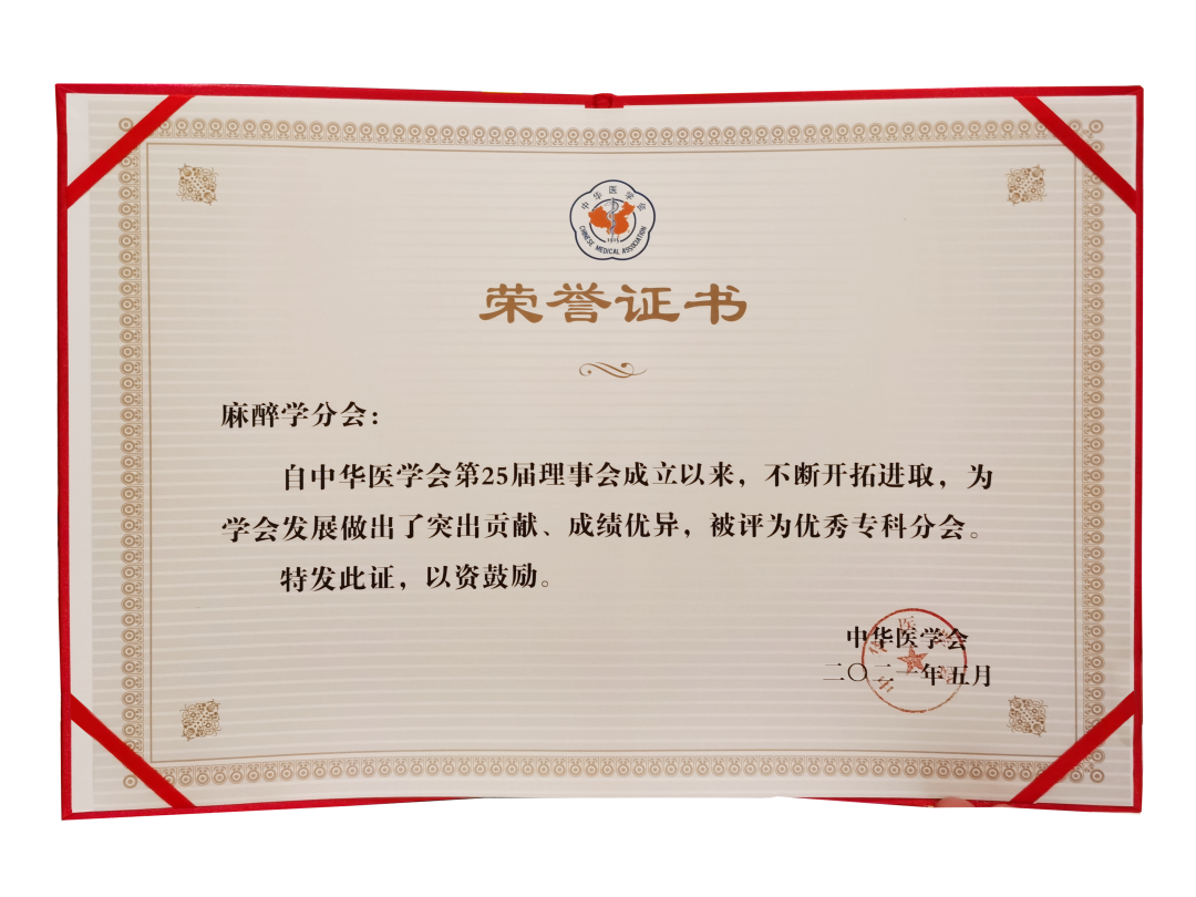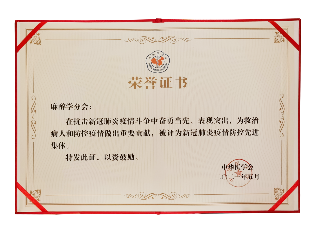 中华医学会麻醉学分会荣获中华医学会优秀专科分会、新冠肺炎疫情防控先进集体“双优”荣誉称号。
