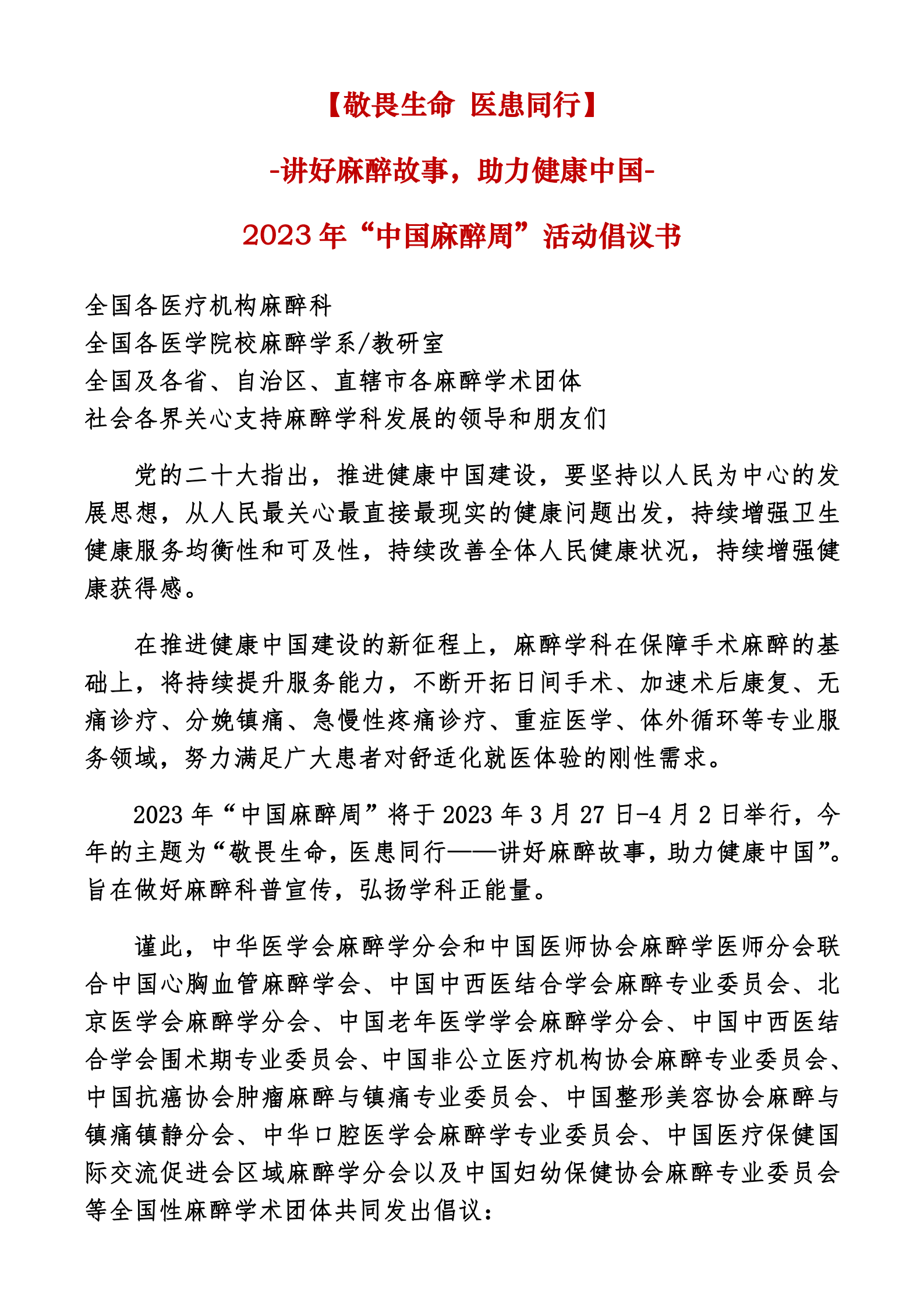 【敬畏生命 医患同行】2023 年“中国麻醉周”活动倡议书