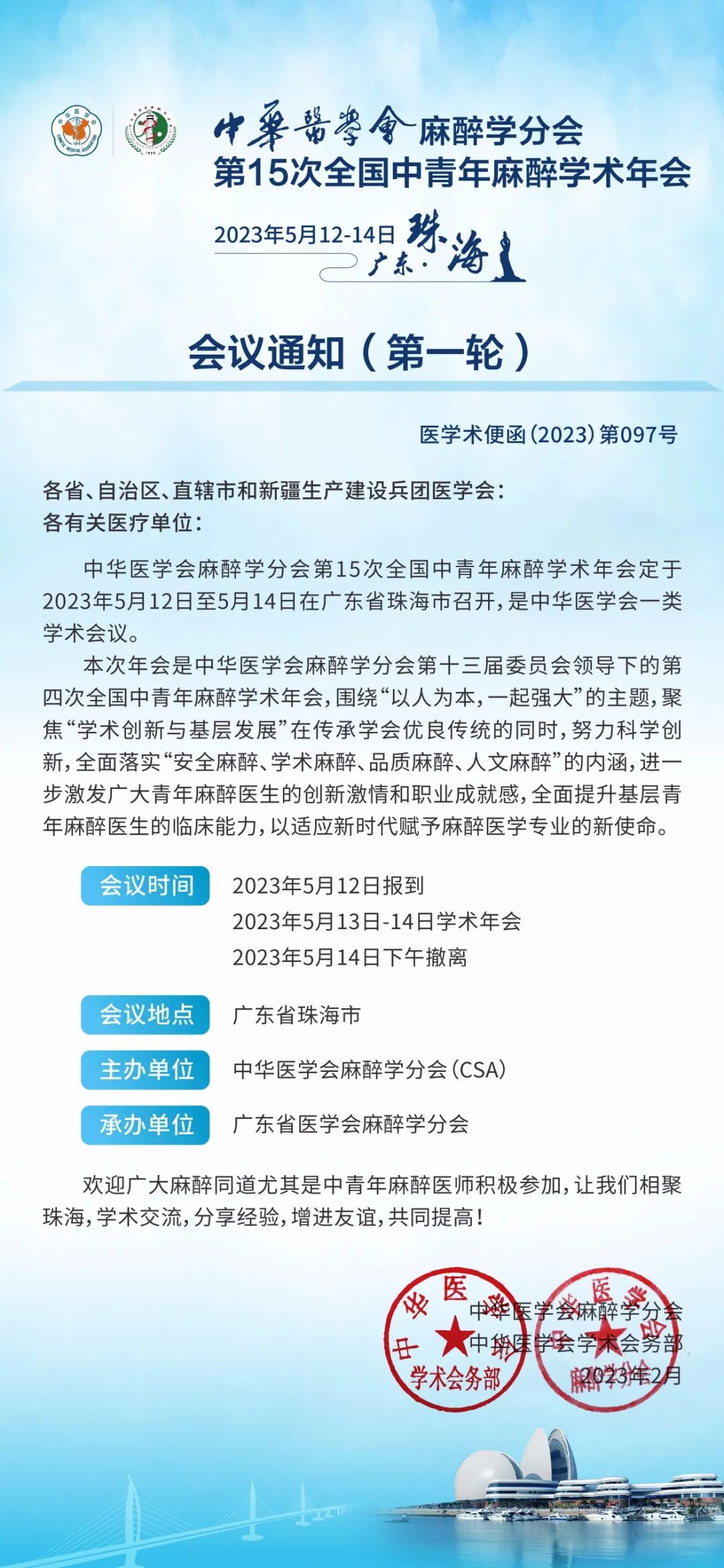 中华医学会麻醉学分会第15次全国中青年麻醉学术年会定于2023年5月12日至5月14日在广东省珠海市召开,是中华医学会一类学术会议。