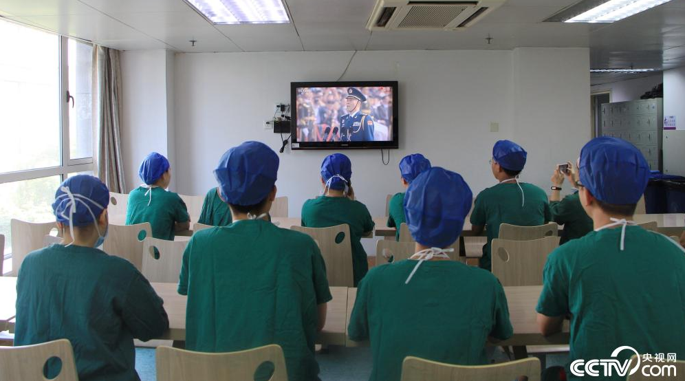 10月1日,庆祝中华人民共和国成立70周年国庆大阅兵仪式在北京天安门广场举行,当天南昌大学第二附属医院值班医务人员利用休息时间观看阅兵仪式现场直播。