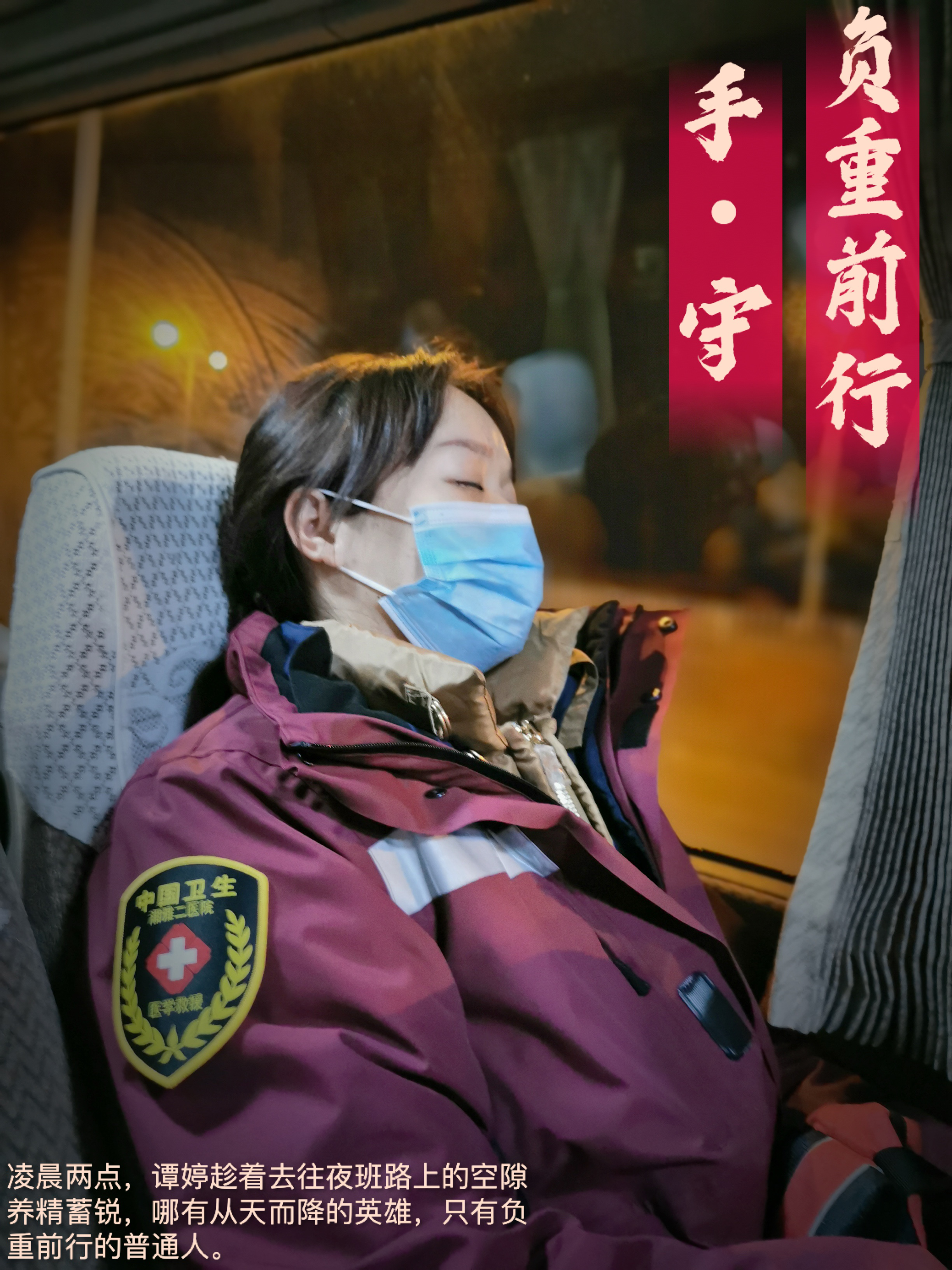 凌晨一点我们坐上班车前往医院值夜班,为了让我们在车上多休息一会儿,司机很贴心的在车上放着舒缓的音乐,大巴车行驶速度很慢、很平稳。长沙的夜很寂静,几乎看不到一个行人,车辆偶尔驶过一辆,转眼消失在夜幕里。这是姑娘们熬过最艰难的夜,然而,她们谁也不愿退缩,谁也不敢轻易倒下。