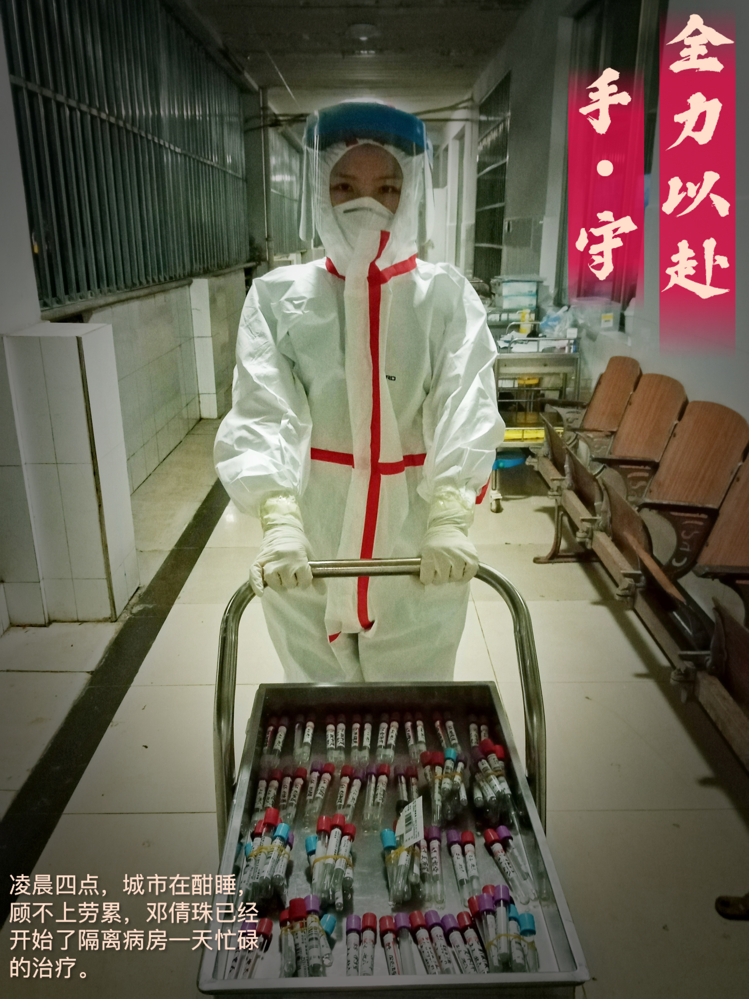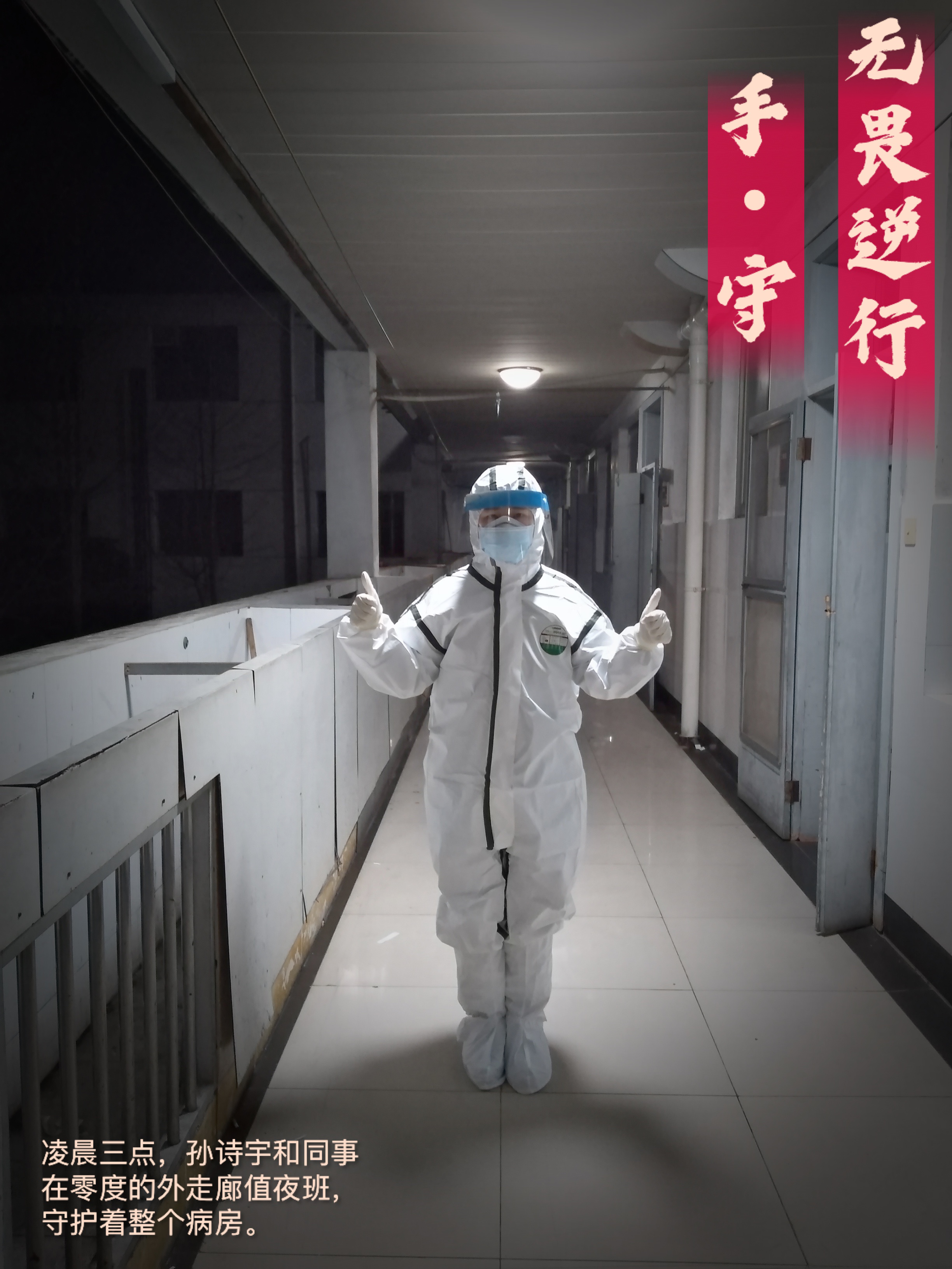 凌晨三四点的长沙下着淅淅沥沥的小雨,气温只有零摄氏度。城市还在酣睡,而她们依然在外楼廊守护着整个病房。早上下班,双手已经冻得麻木,脸上也被口罩和护目镜压伤了。她们却只是笑着说,没事,明天就会好了。寒冷的晚风吹不散我们滚烫的斗志,繁重的工作击不退我们必胜的信心。