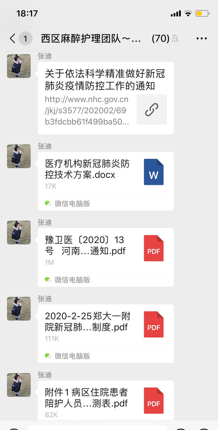疫情伊始,张迪护士长立刻建立院感知识宣讲群,每日传达关于新冠肺炎相关文件,搜集相关防控文章,将最新的防控知识传达给每名护理人员。