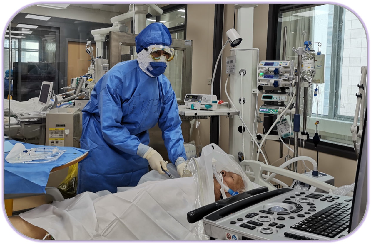 第二天一早,从洛阳转来一位86岁的患者,需要尽快进行深静脉穿刺置管。患者身体极度瘦弱,血管弹性很差,穿刺难度极大。即使借助了超声引导,却始终无法顺利完成穿刺。也许是一天没有休息的缘故,穿上防护服不久我就大汗淋漓,视野也开始模糊。想到患者急需这些生命通道,我顾不得感染病毒的风险,把头尽量靠近患者的身体,咬牙坚持,终于完成置管。身边的战友做了个点赞的手势,透过结满雾气的护目镜,我看到他的眼神里除了赞许,还有信心、希望与热情……。