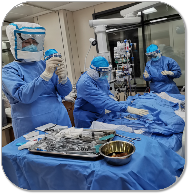 2月26日要给两位患者调整治疗方案,操作时间会比较久。我和同事进入病房后紧张有序地给患者进行中心静脉置管,肱动脉鞘管置入,两例ECMO导管置入,为患者进行股动脉切开缝合术。第一次担任器械护士和手术助手,而且是在层层防护的隔离病房,其难度可想而知。汗水在防护服下尽情的流淌,双手被三层手套紧紧箍着。穿针引线,传递器械,拉勾暴露,压迫止血,平日里在手术室看到的简单娴熟操作,今天做起来却显得那么笨拙。