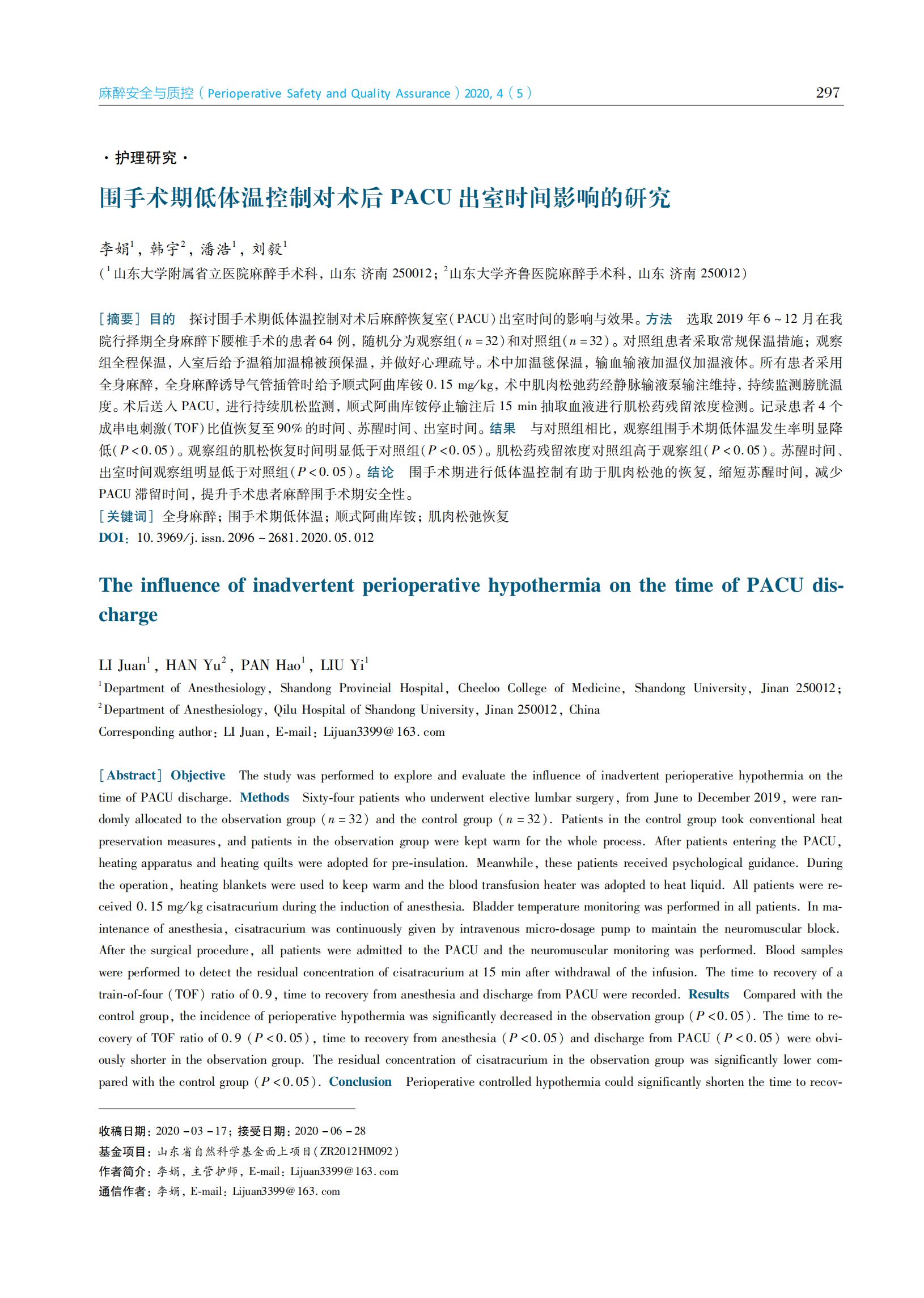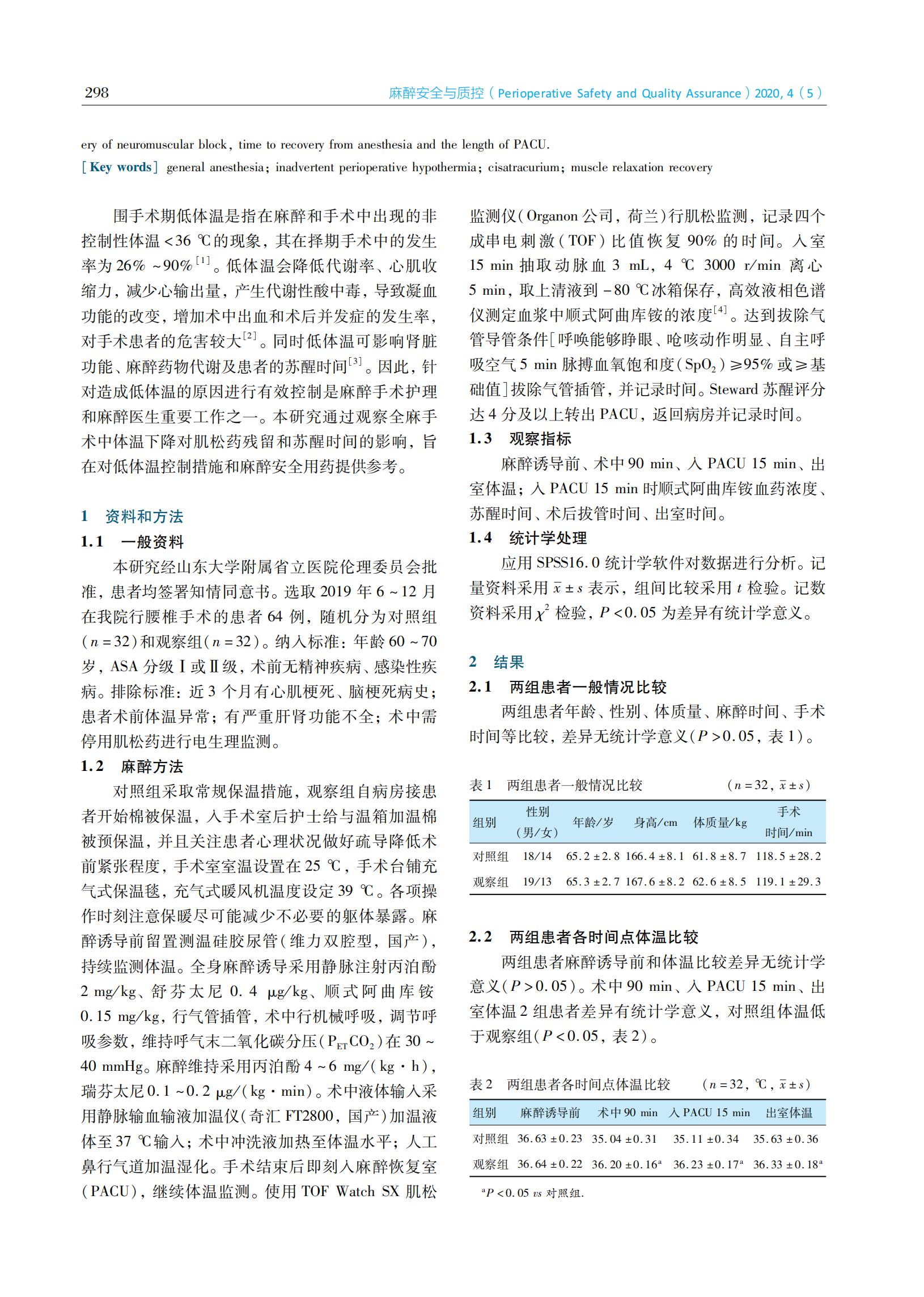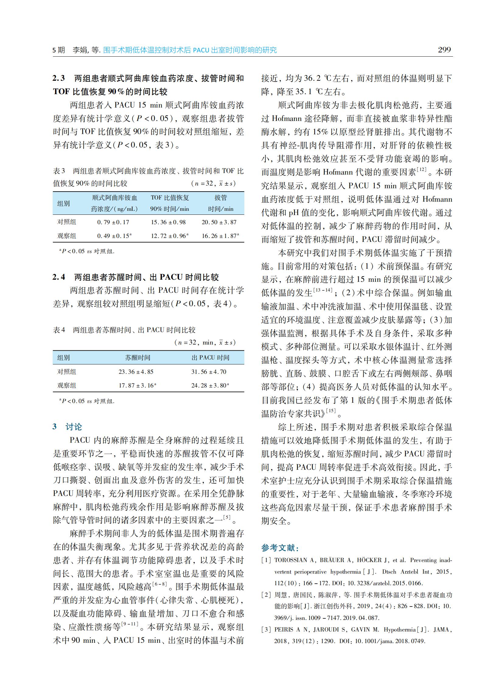 围手术期低体温控制对术后PACU出室时间影响的研究