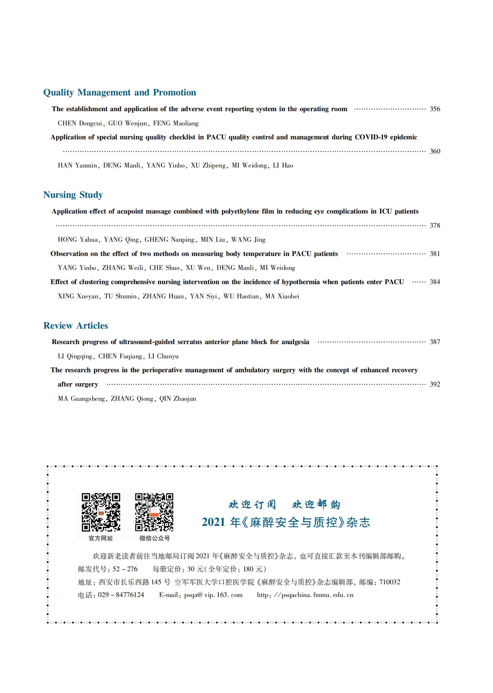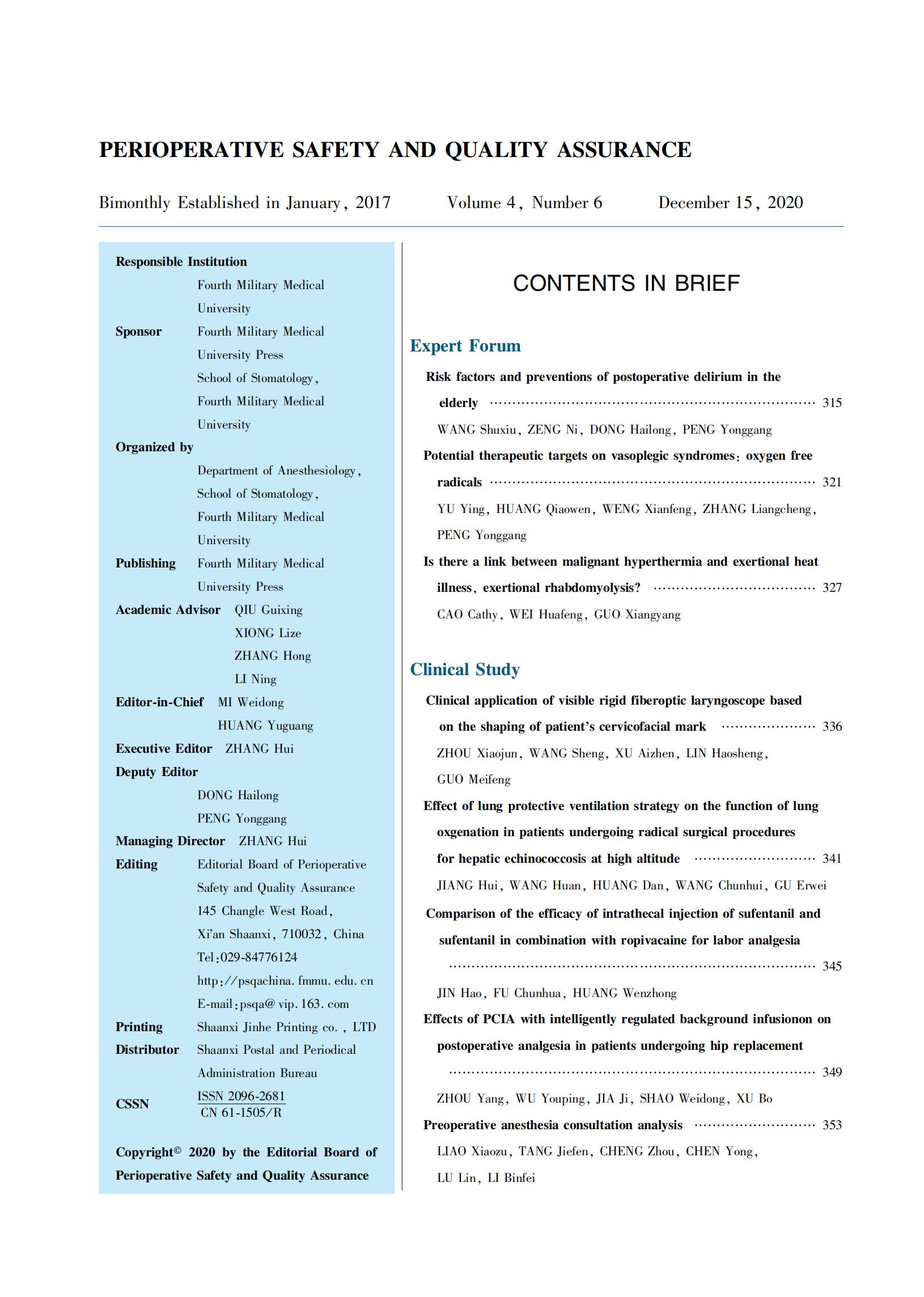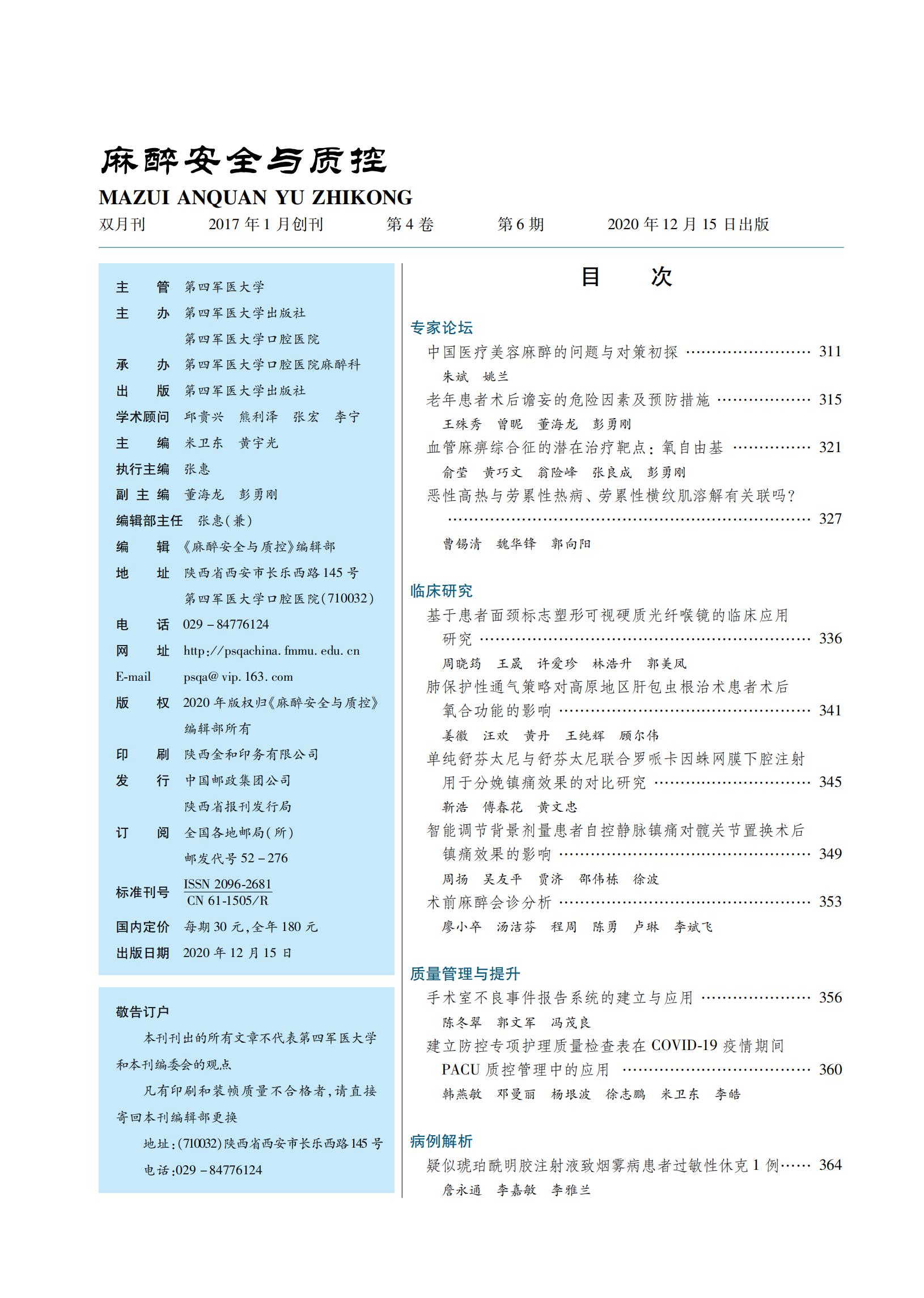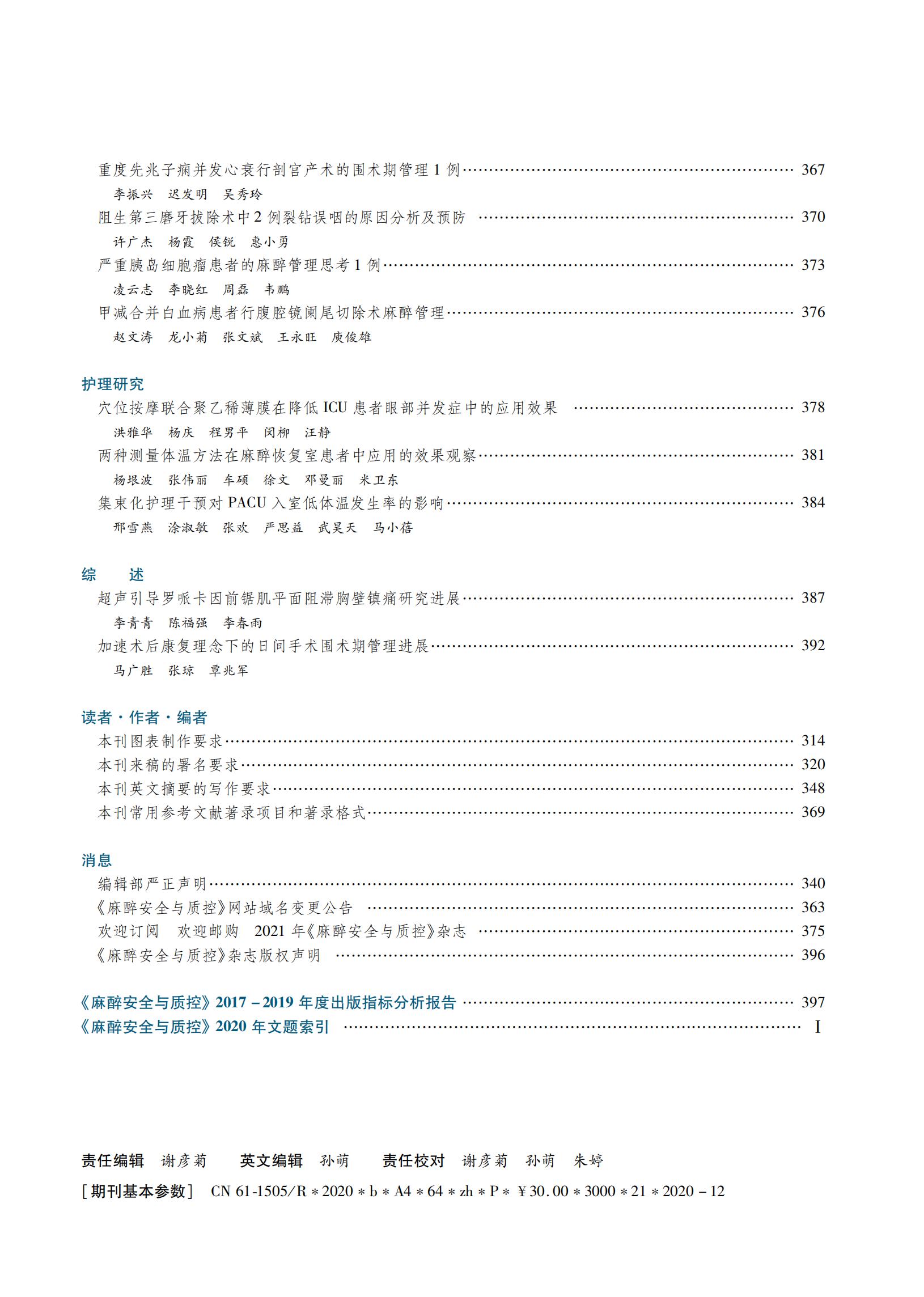 目录 | 《麻醉安全与质控》2020年 12 月第 4 卷 第 6 期