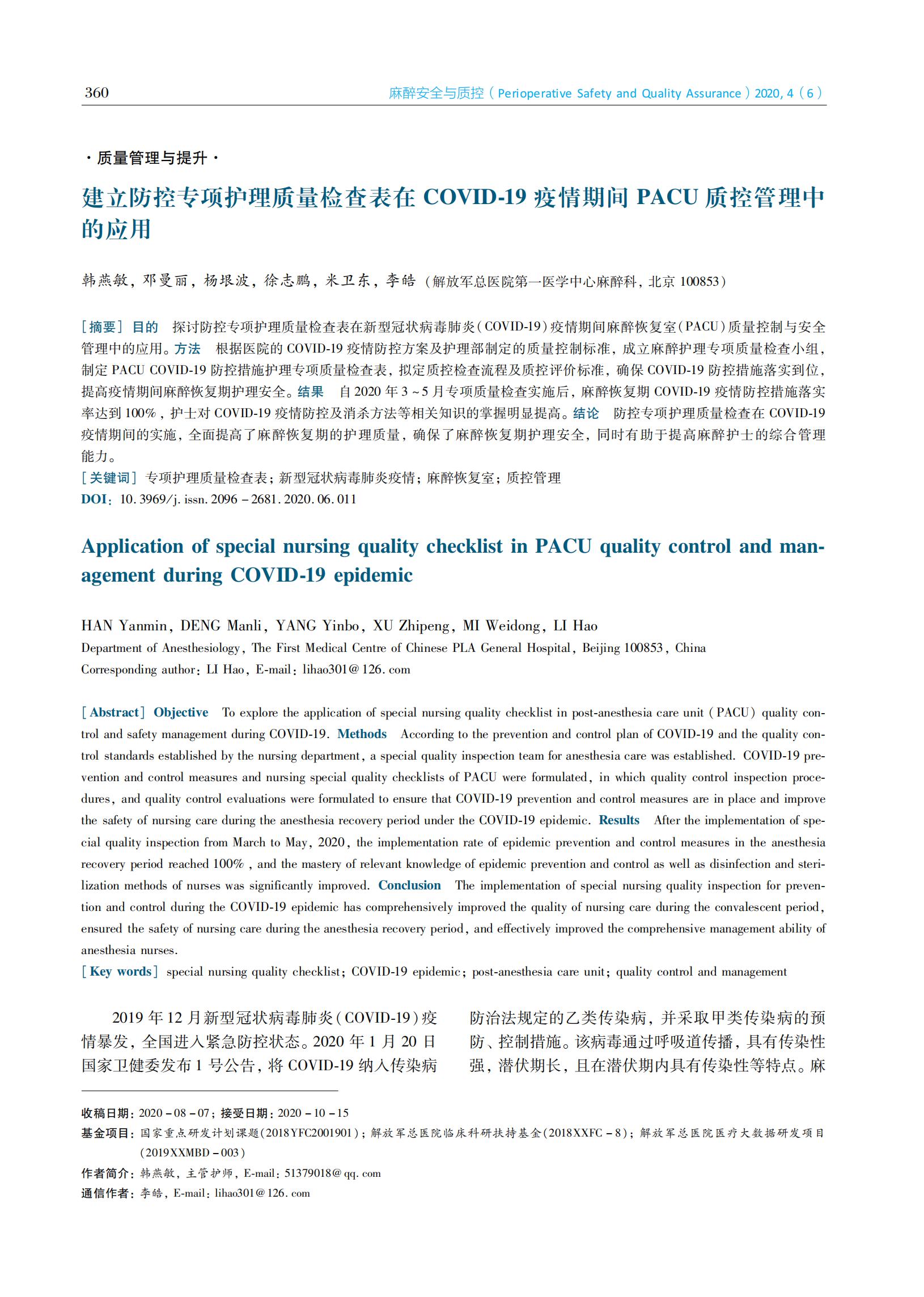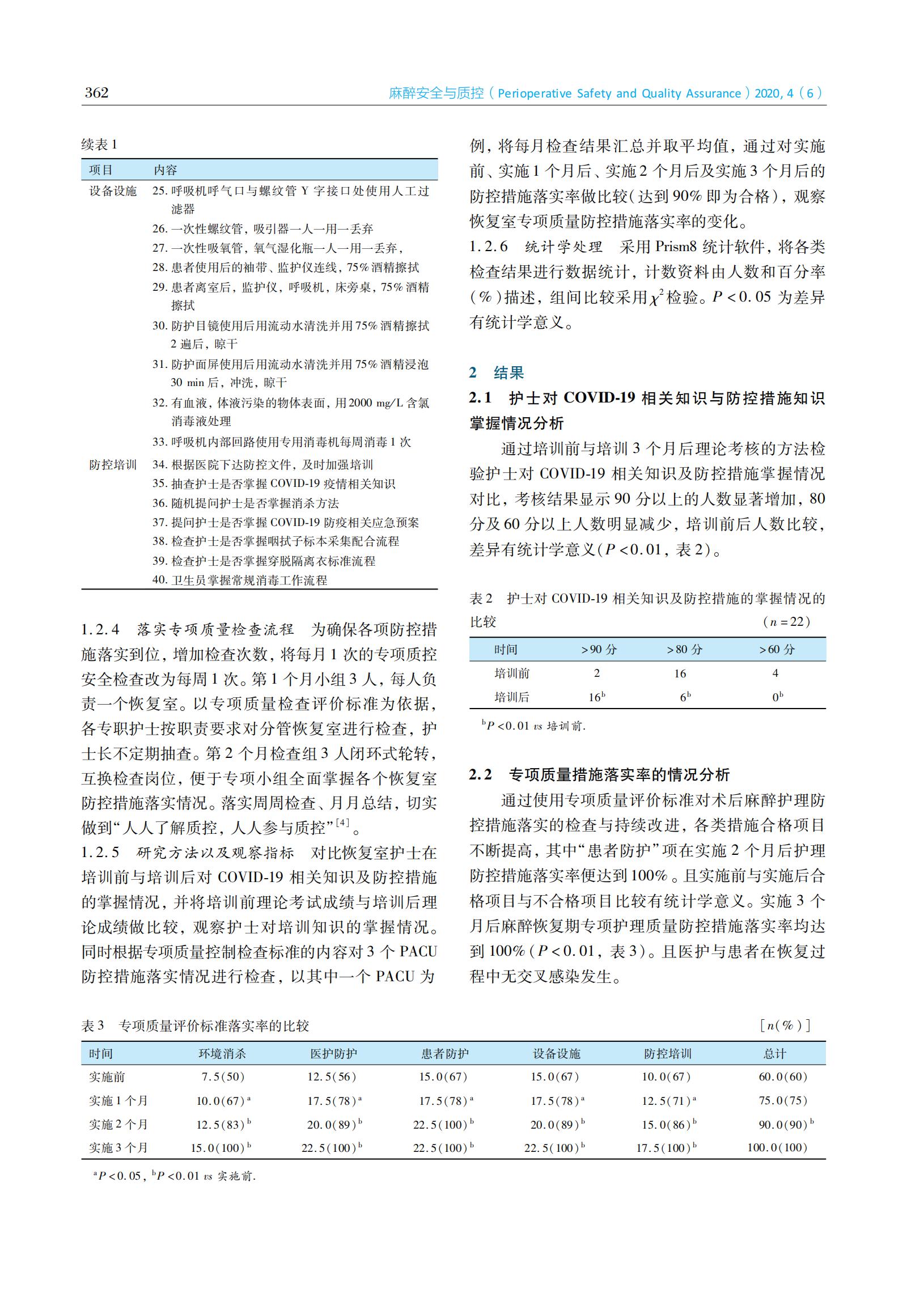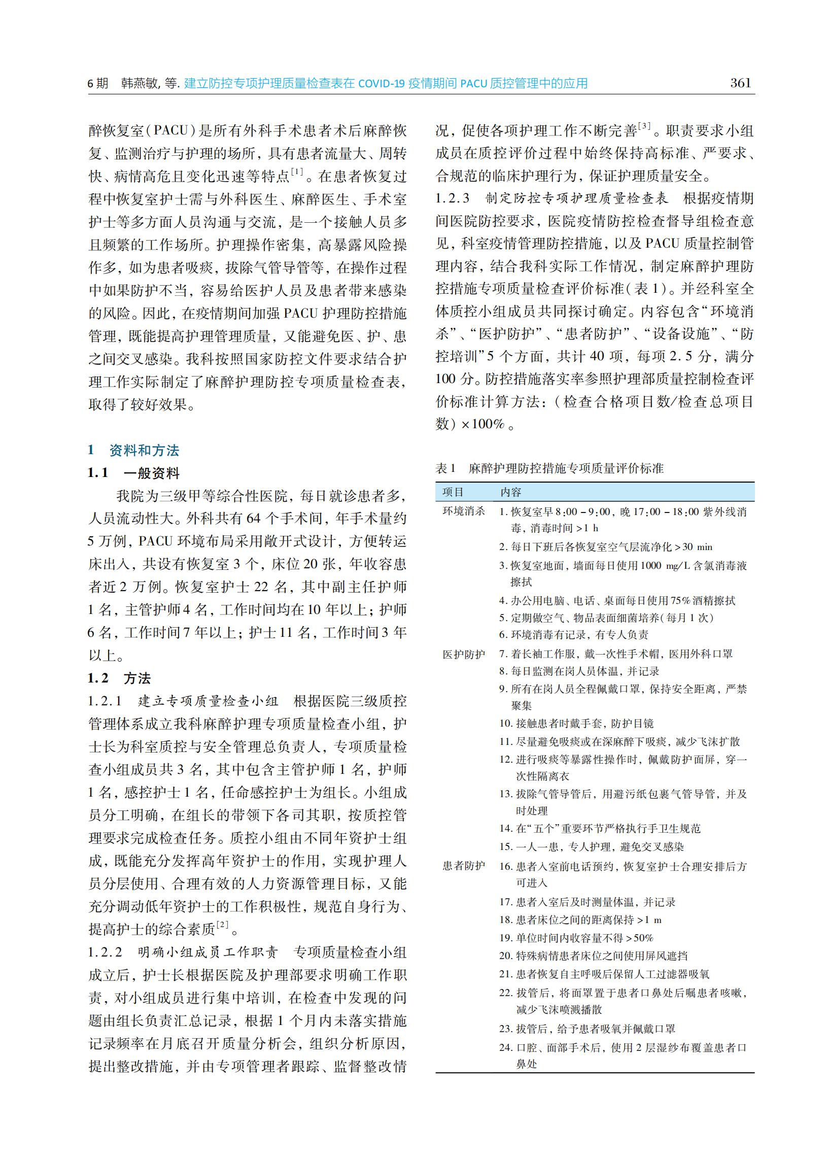 建立防控专项护理质量检查表在COVID-19疫情期间PACU质控管理中的应用