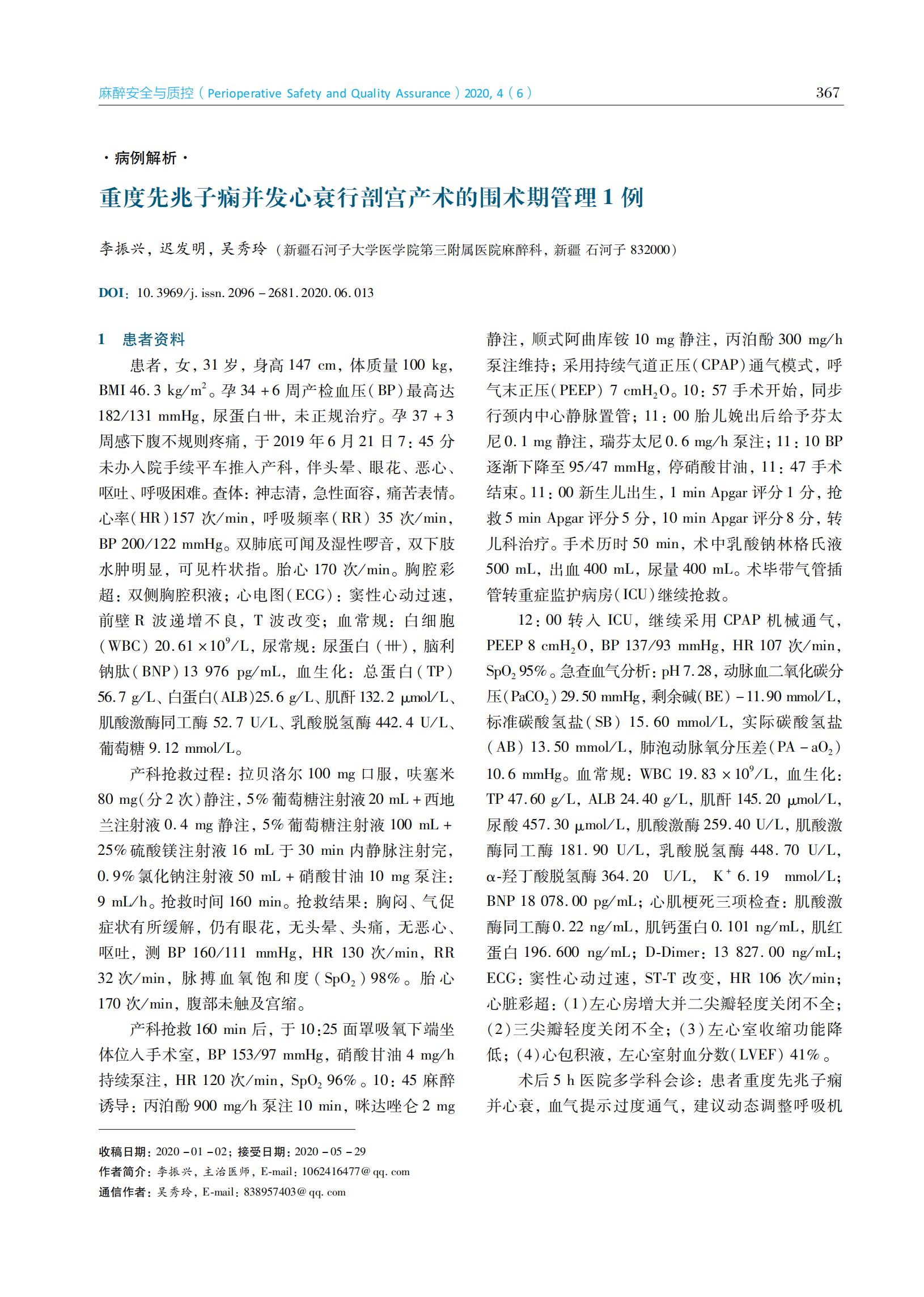 重度先兆子痫并发心衰行剖宫产术的围术期管理1例