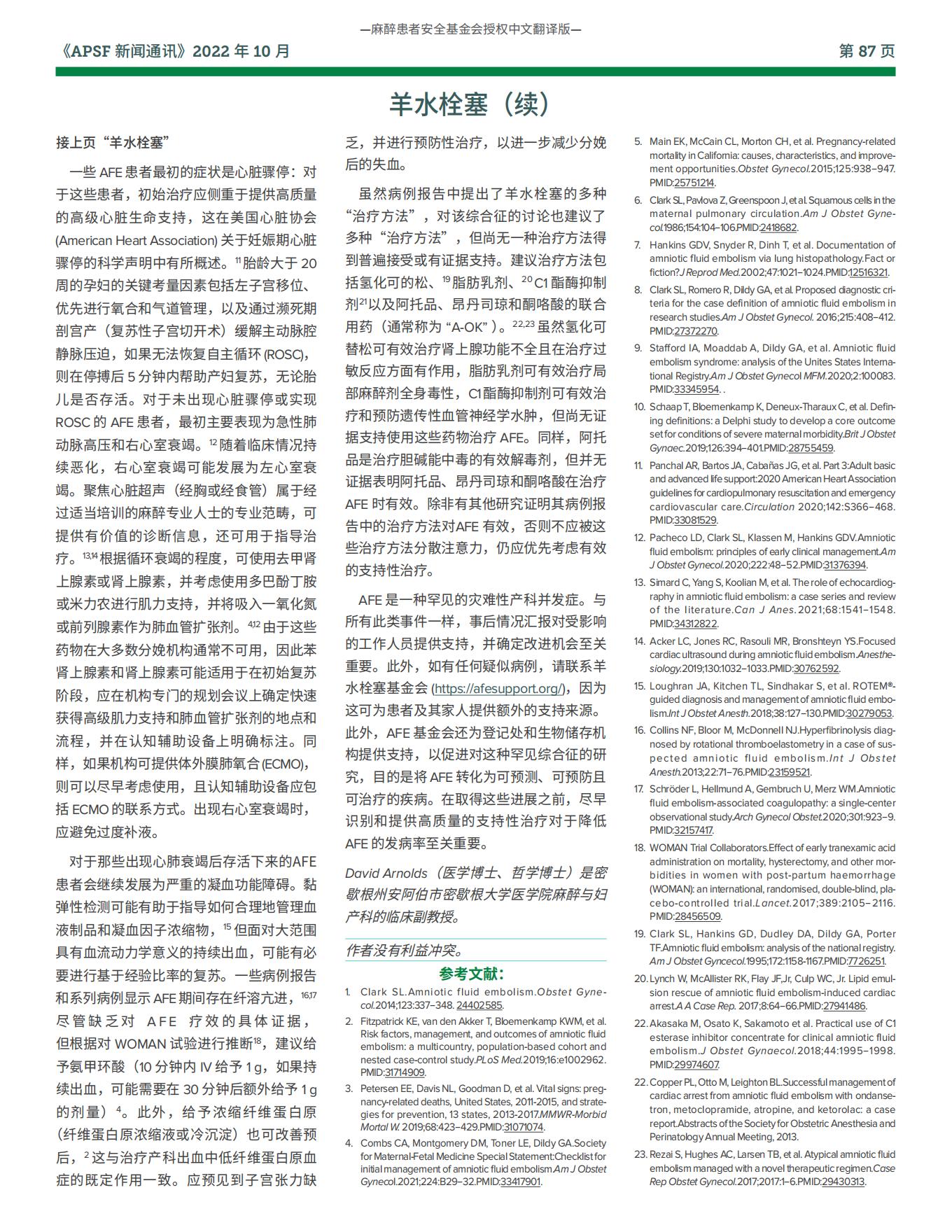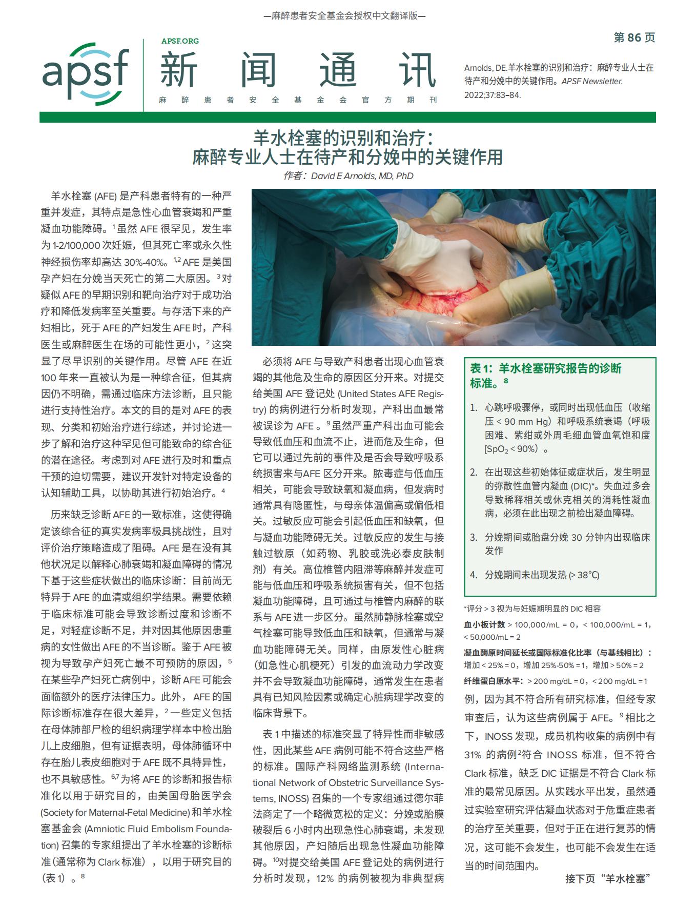 【APSF新闻通讯】羊水栓塞的识别和治疗: 麻醉专业人士在待产和分娩中的关键作用