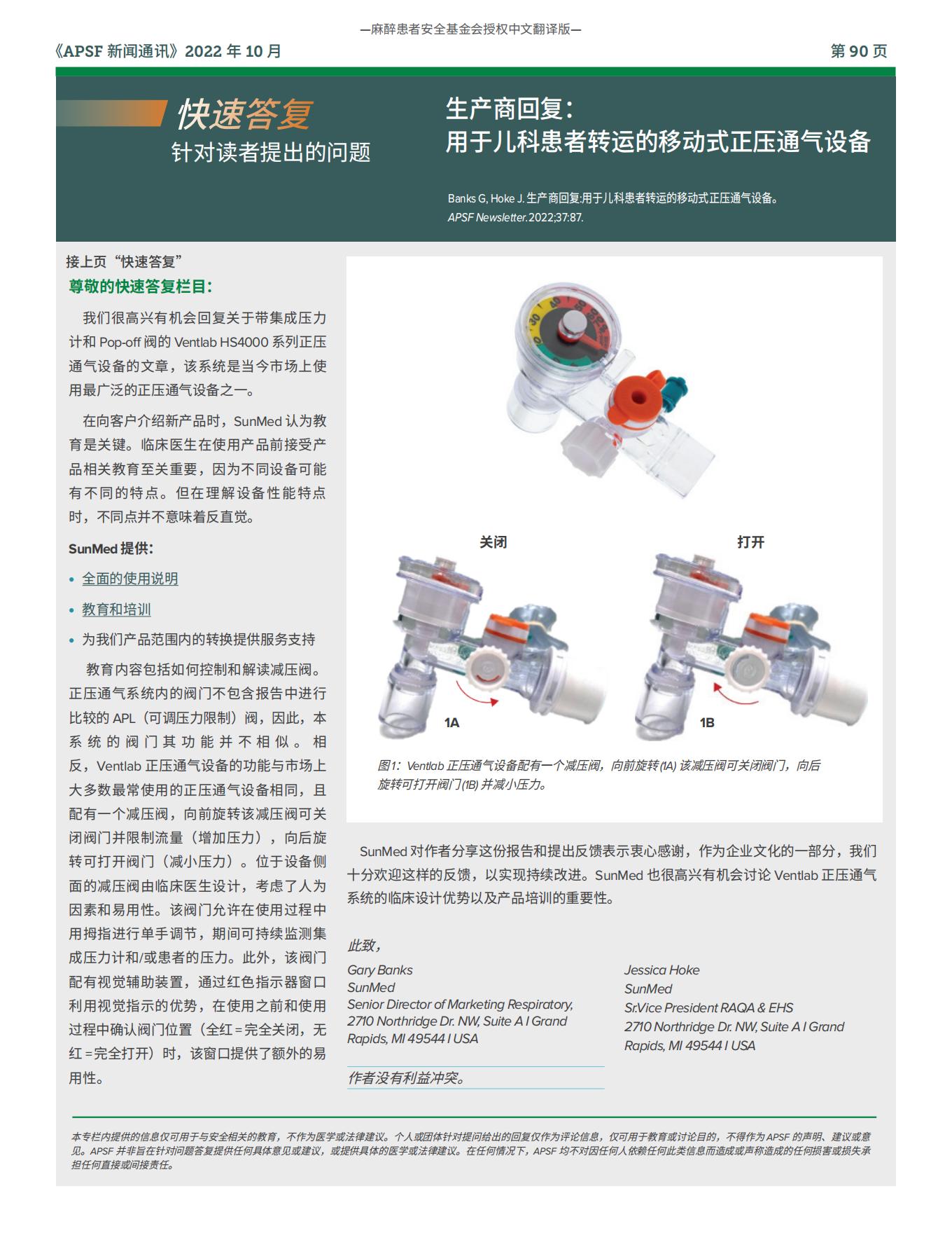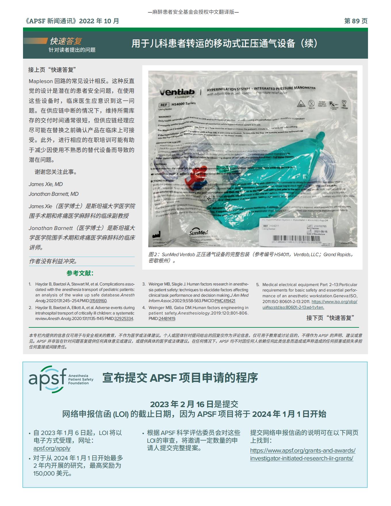 【APSF新闻通讯】用于儿科患者转运的移动式正压通气设备