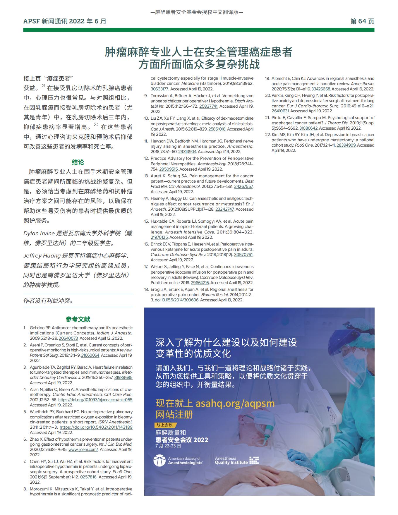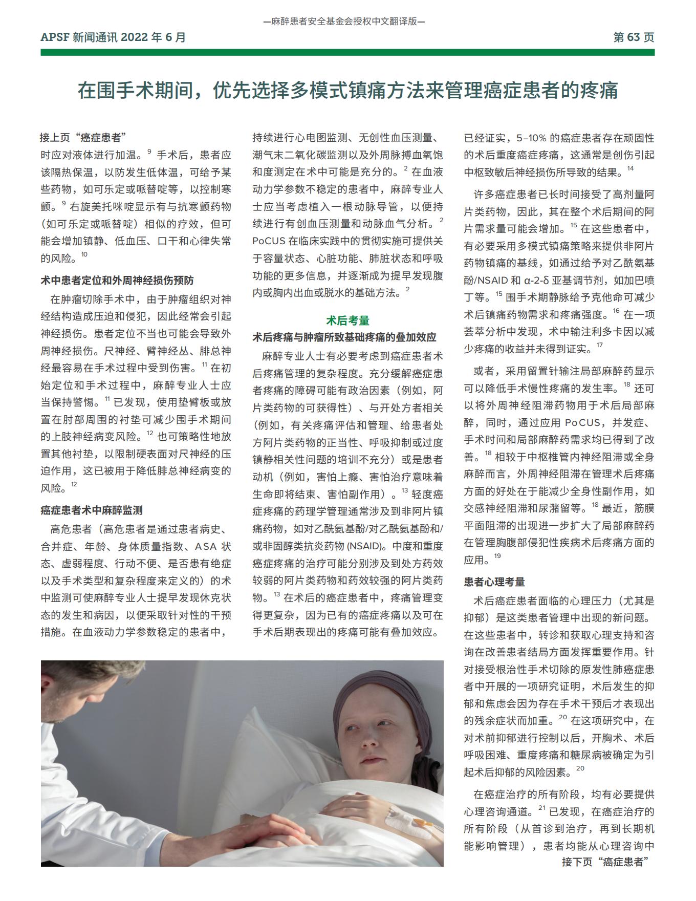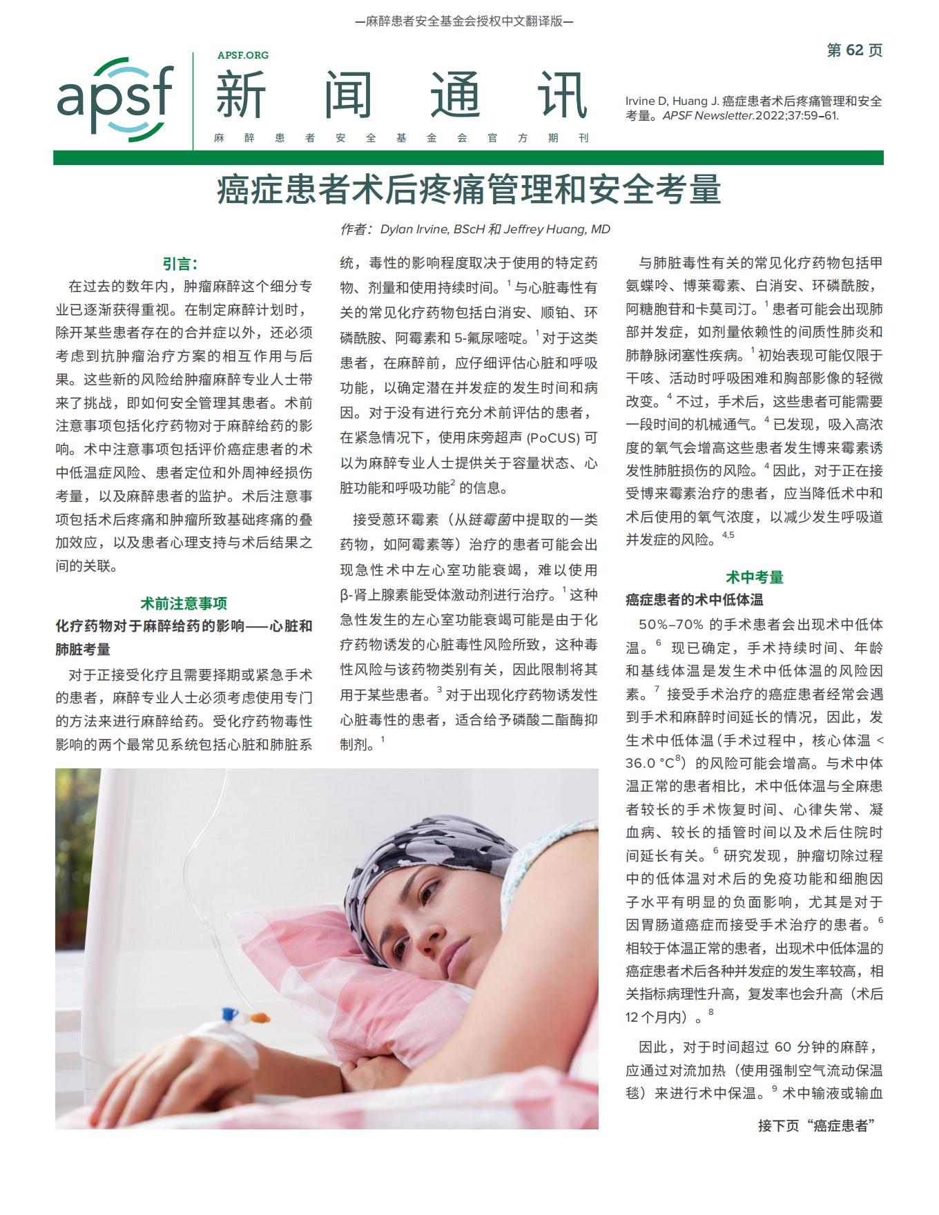【APSF新闻通讯】癌症患者术后疼痛管理和安全考量