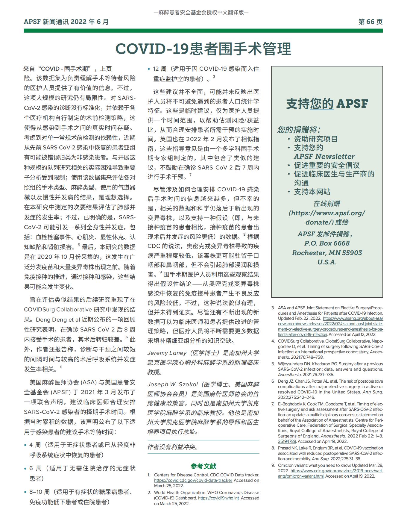 【APSF新闻通讯】COVID-19患者围手术期管理